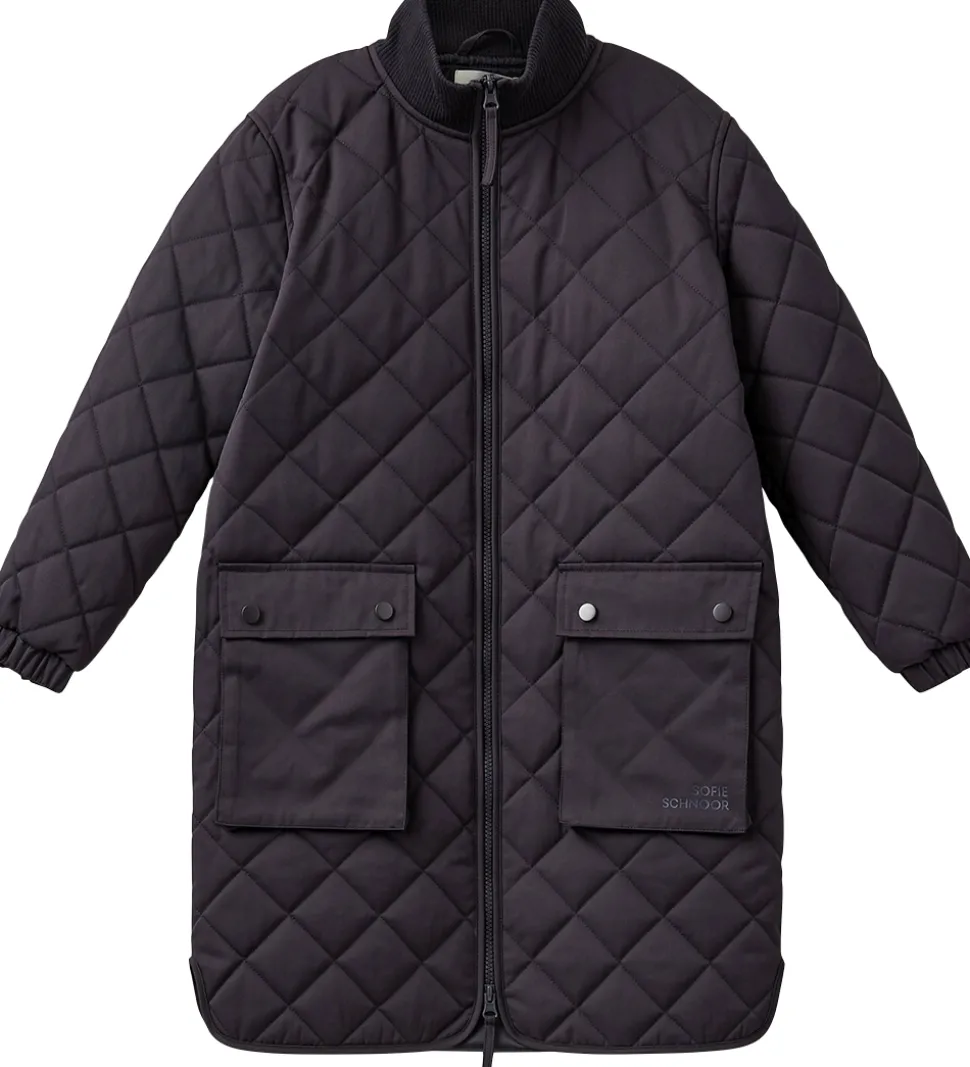 Sofie Schnoor termojakken er en lang model og har lange ærmer med brede elastikkanter ved håndleddene. Jakken kan åbnes med en gennemgående lynlås, og store lommer i hver side med trykknapper.