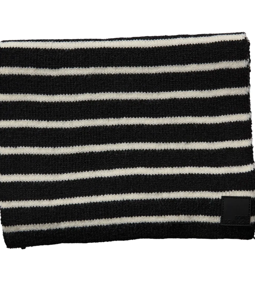 Flot Sofie Schnoor tørklæde med sorte og hvide striber. Sofie Schnoor tørklædet tilføjer et stilfuldt element til garderoben med et tidløst stribedesign, der er både praktisk og moderne.