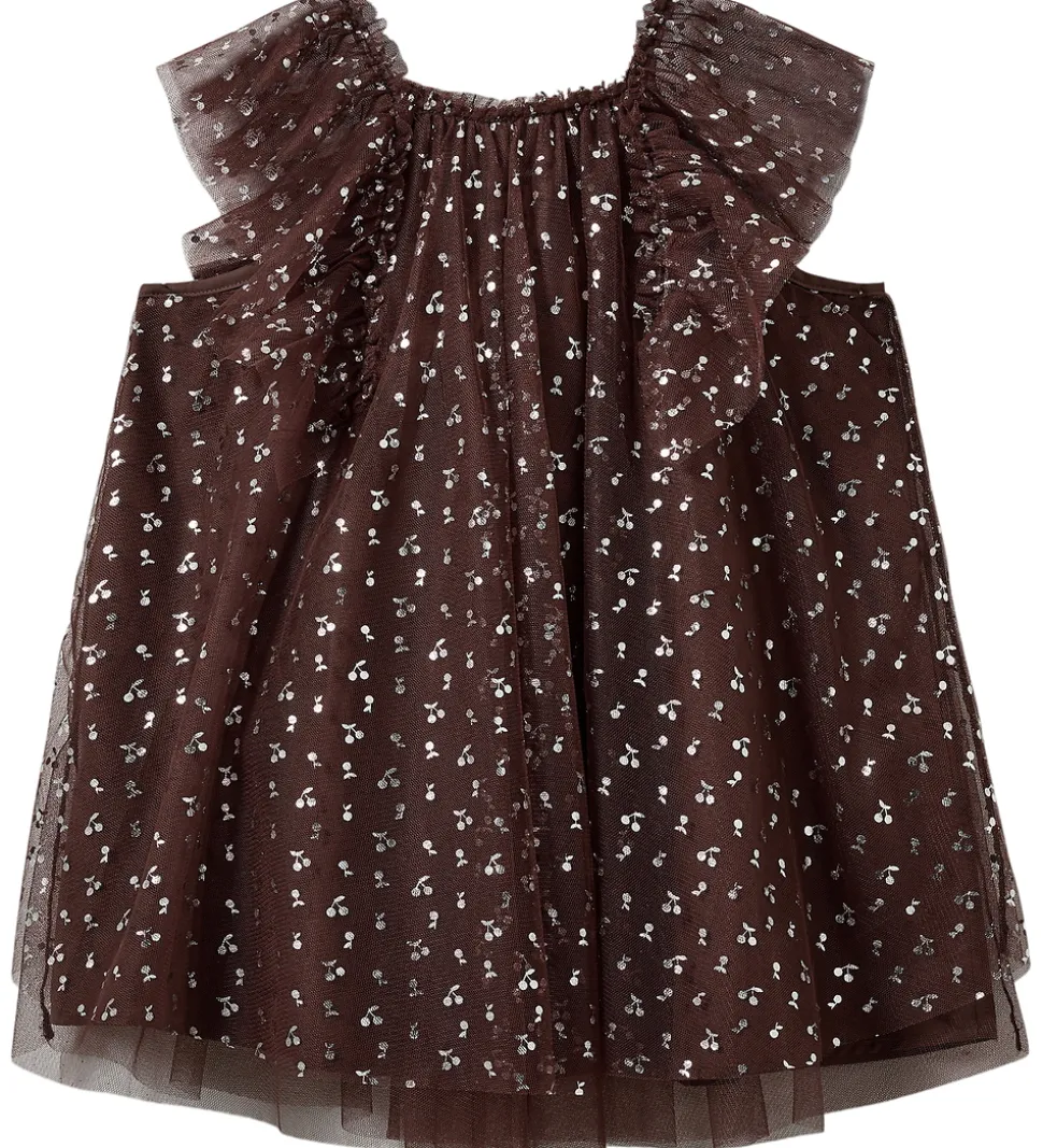 Elegant Sofie Schnoor tylkjole i en rødbrun nuance med et delikat mønster af små sølvfarvede kirsebær.