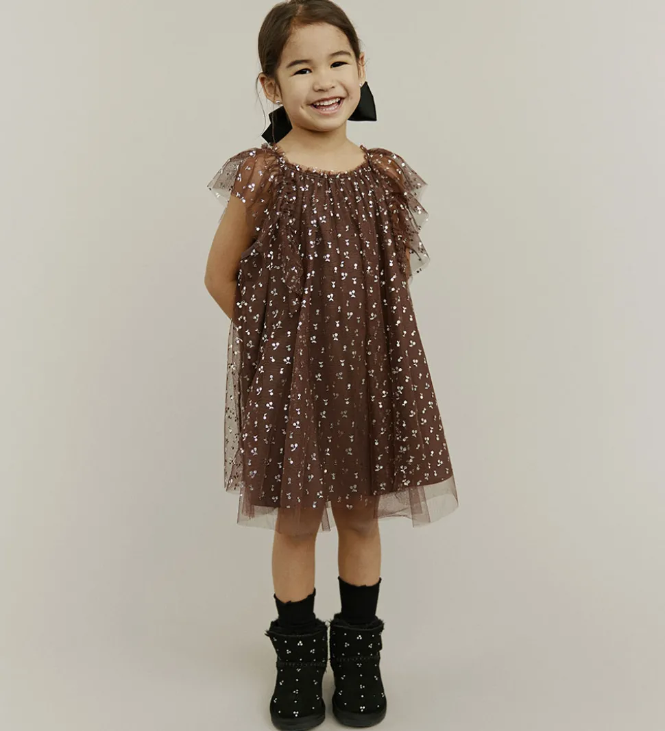 Sofie Schnoor tylkjolen har en luftig tyl-struktur med flæser omkring ærmerne, der giver et sofistikeret udtryk. Materialet er let og gennemsigtigt med en underkjole, der sikrer god dækning. Kjolen har en rund halsudskæring.
