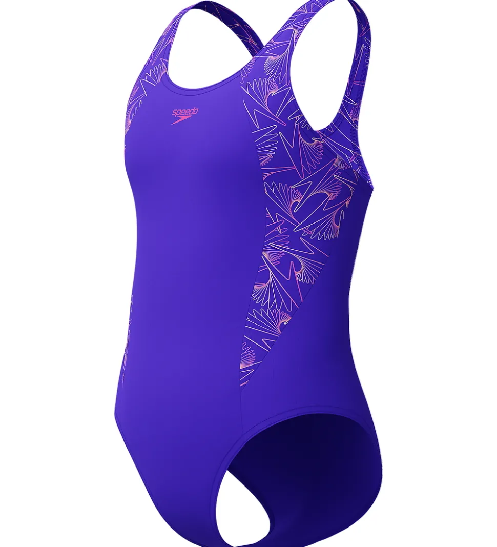 Flot Speedo badedragt i lilla, og i siderne og på stropperne er der et flot mønster i pink og orange nuancer.