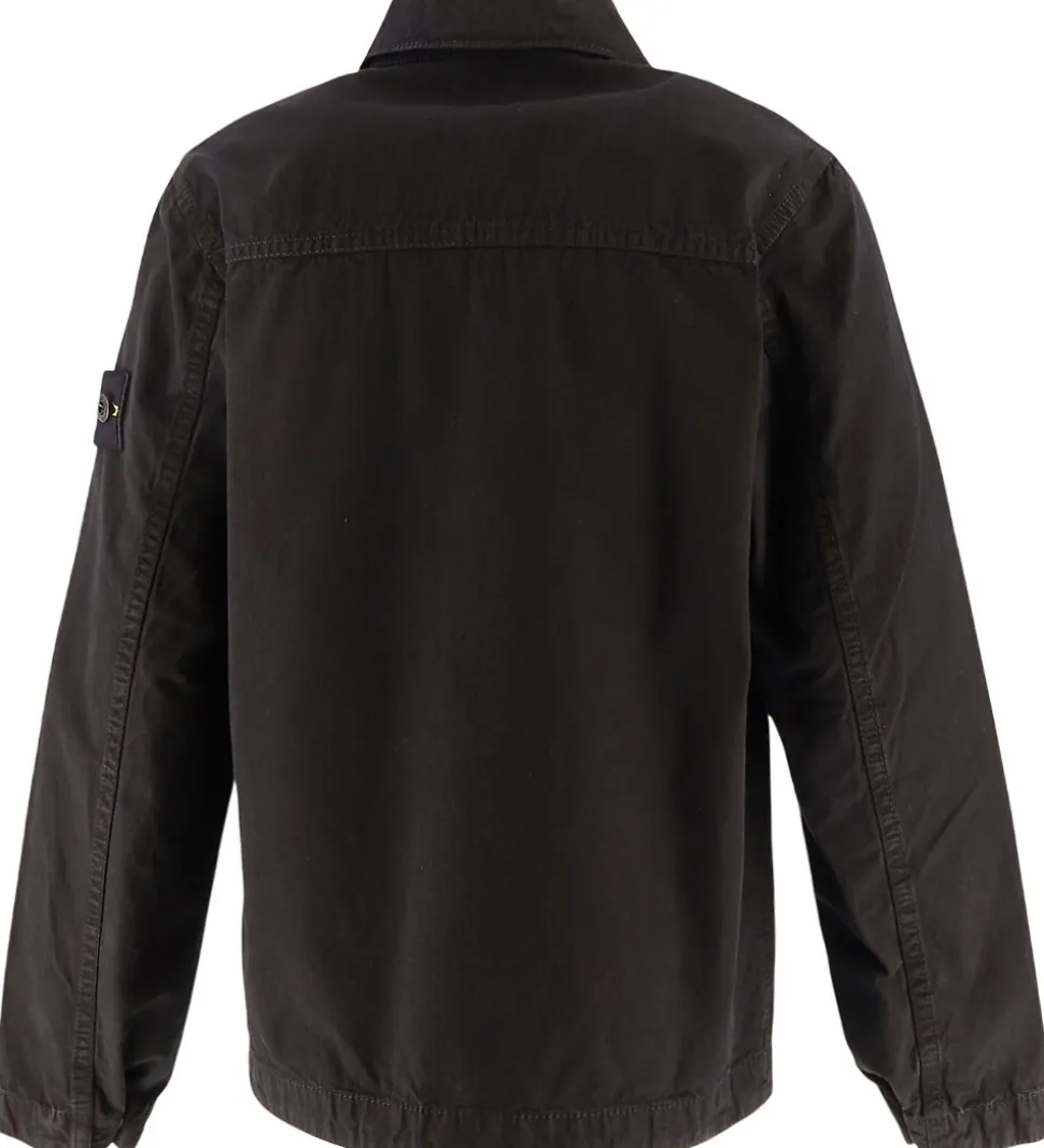 Lækker Stone Island jakke i ensfarvet sort i en let, fastvævet bomuldskvalitet og med en sort lynlås. Øverst på venstre ærme sidder det ikoniske logomærke fast med knapper.
