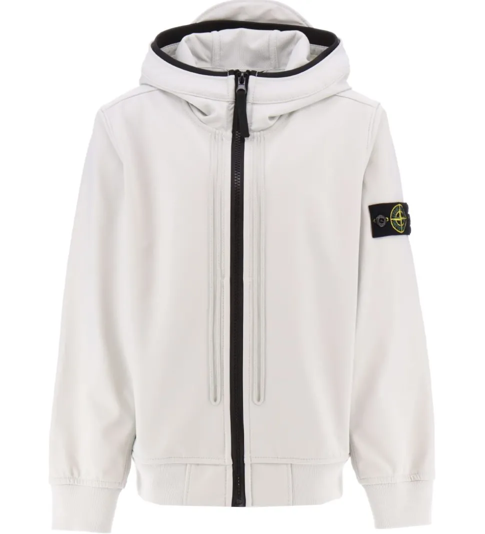 Flot Stone Island softshelljakke i ensfarvet lysegrå og med en sort lynlås. Øverst på venstre ærme sidder det ikoniske logomærke fast med knapper.