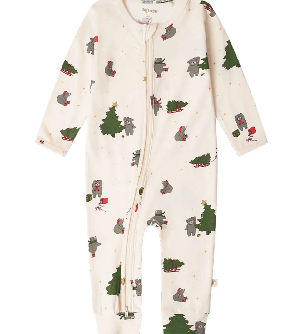 Charmerende heldragt fra Thats Mine i en blød, lys nuance med et sødt juletema. Mønstret består af bjørne, juletræer og gaver, som skaber en hyggelig stemning.