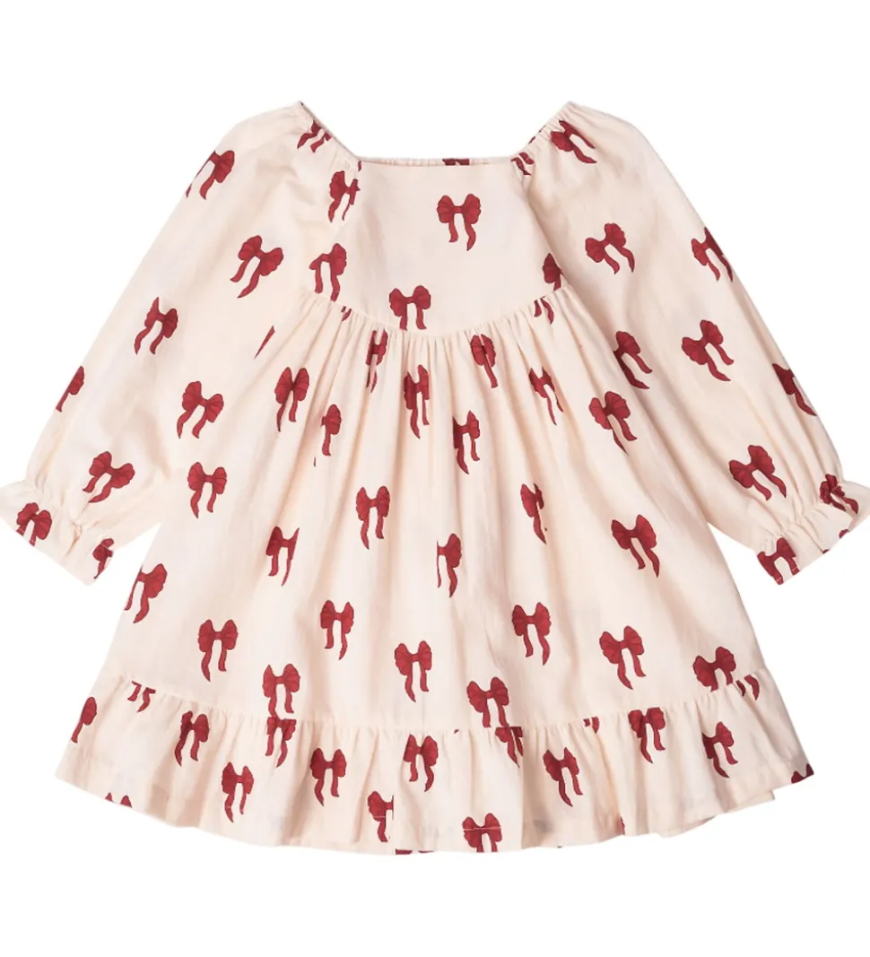 Elegant kjole fra Thats Mine i en lys beige nuance med et charmerende print af røde sløjfer. Kjolen har lange ærmer og en løs pasform med flæsedetaljer ved bunden for et luftigt udtryk. Thats Mine kjolen er designet i et let materiale, der sikrer bevægelighed.