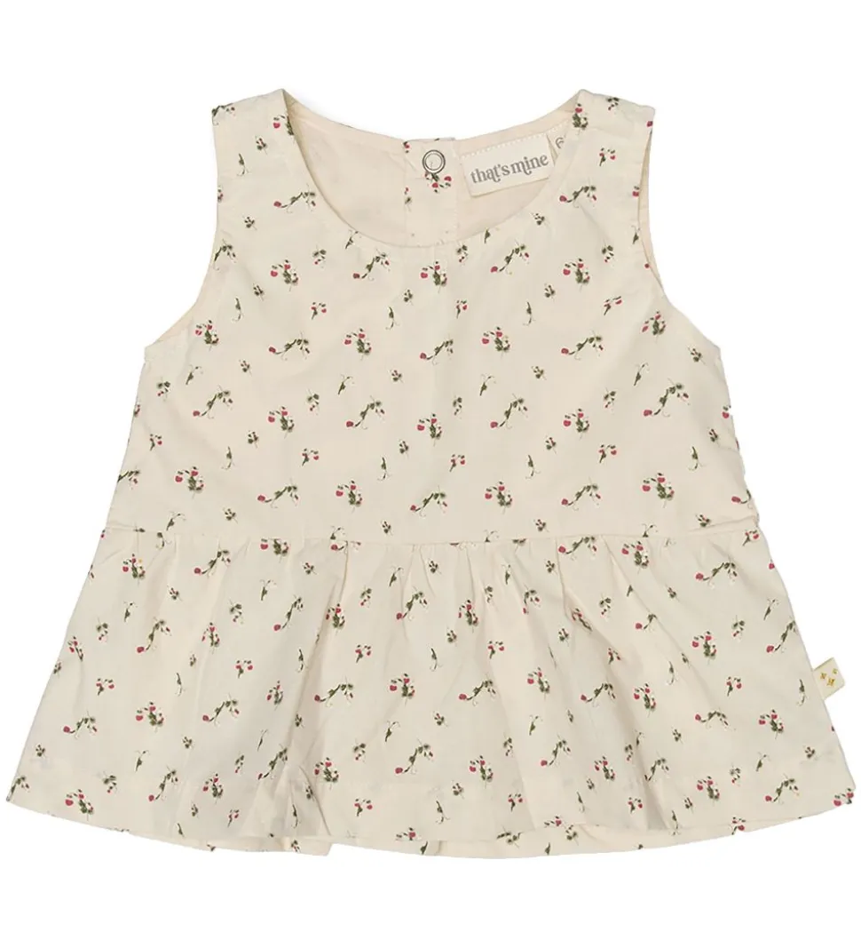 Fin That’s Mine Top i beige med allover print af røde jordbær og hvide blomster.