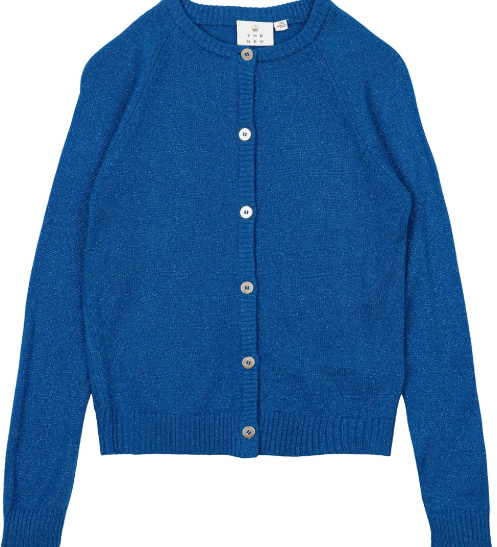 Attraktiv Cardigan med lange ærmer fra The New i en dyb blå nuance med glitter og en strikket struktur. Den har en enkel knaplukning og et tidløst design, der gør den ideel til forskellige anledninger.