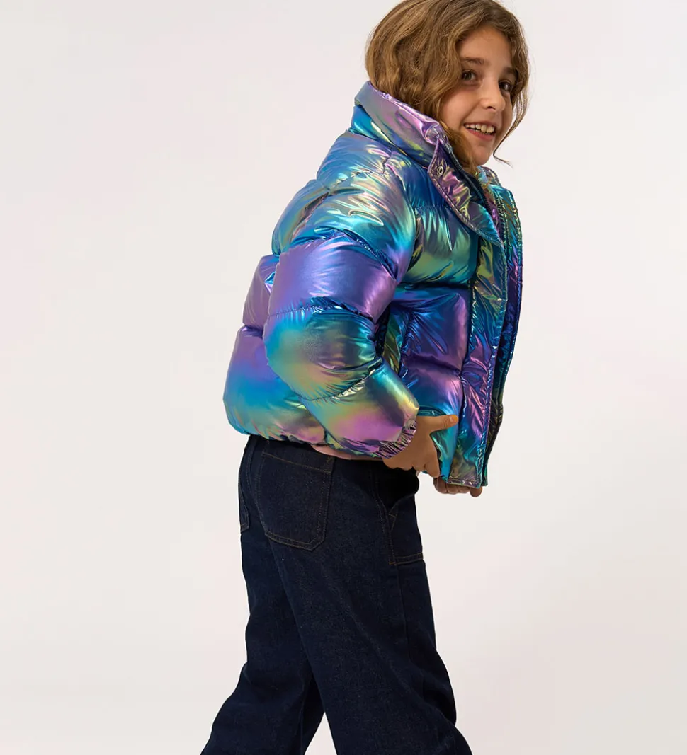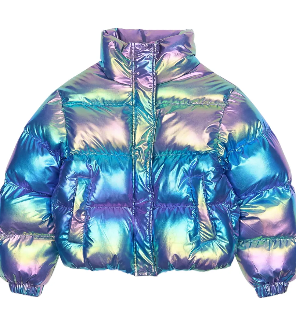 Lækker The New dynejakke skinnende og nuanceret design med changerende farver i lilla, blå, grøn og guld. Dynejakken har vandrette syninger.