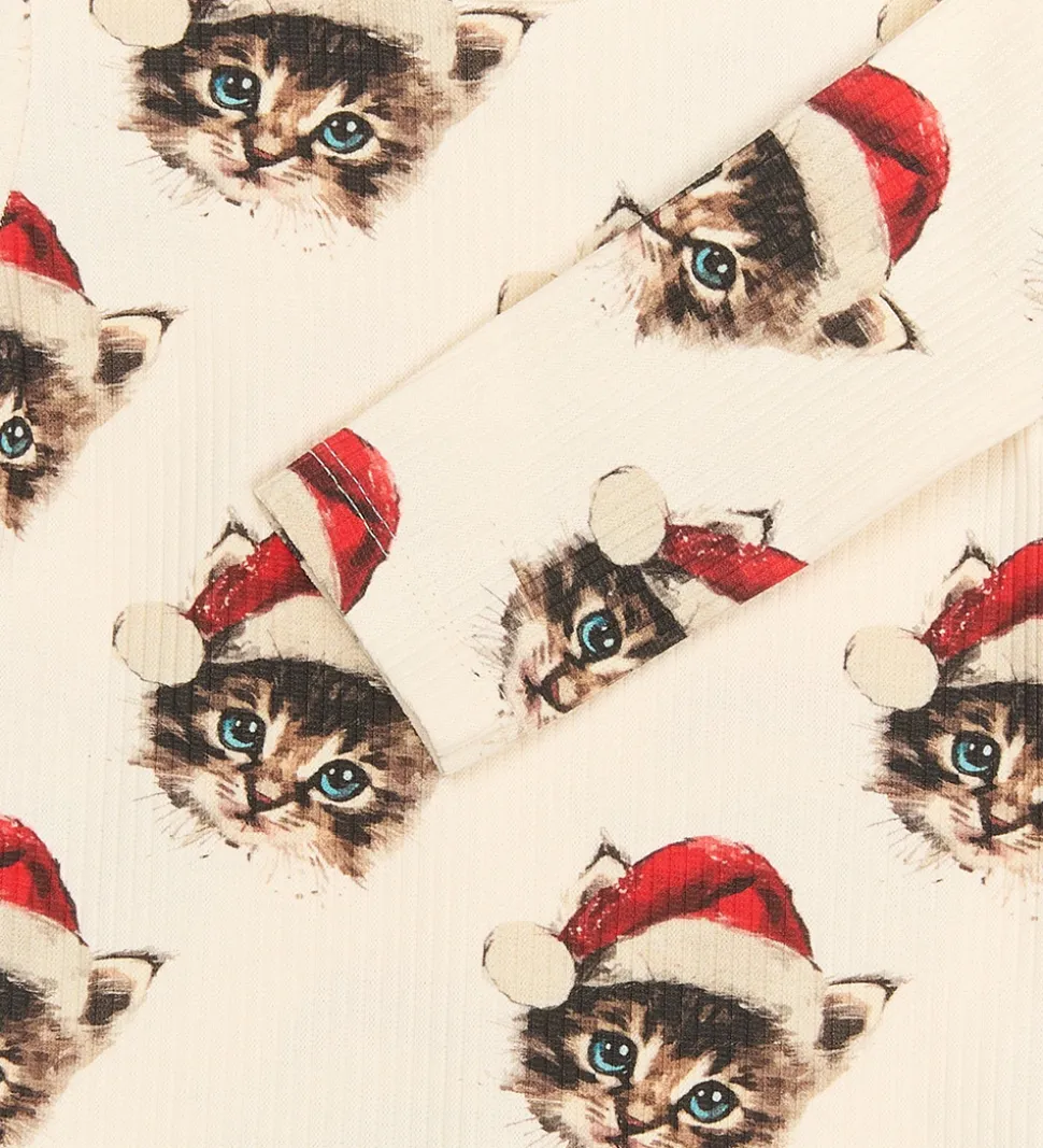 Charmerende The New Siblings heldragt i en cremet farve med et yndigt print af katte iført julehuer, samt med en lækker ribstruktur.