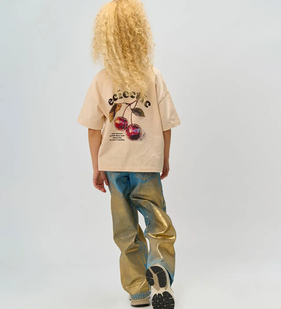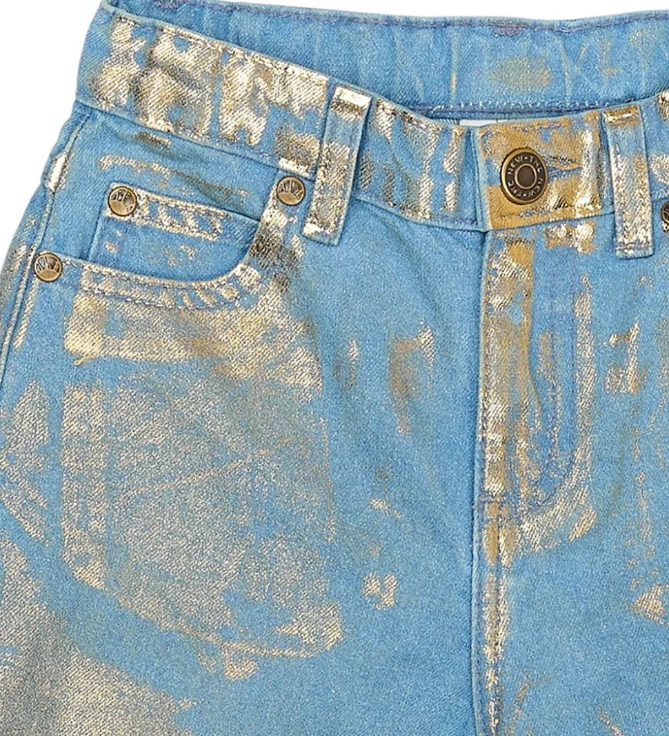 Festlige The New jeans i blå denim med guld glimmer. The New jeansene har en elastisk talje, som kan justeres med knapper indvendigt. De lukkes fortil med en hægte og lynlås. Jeansene har bæltestropper og lommer på for- og bagside. De har en afslappet pasform med vide ben.