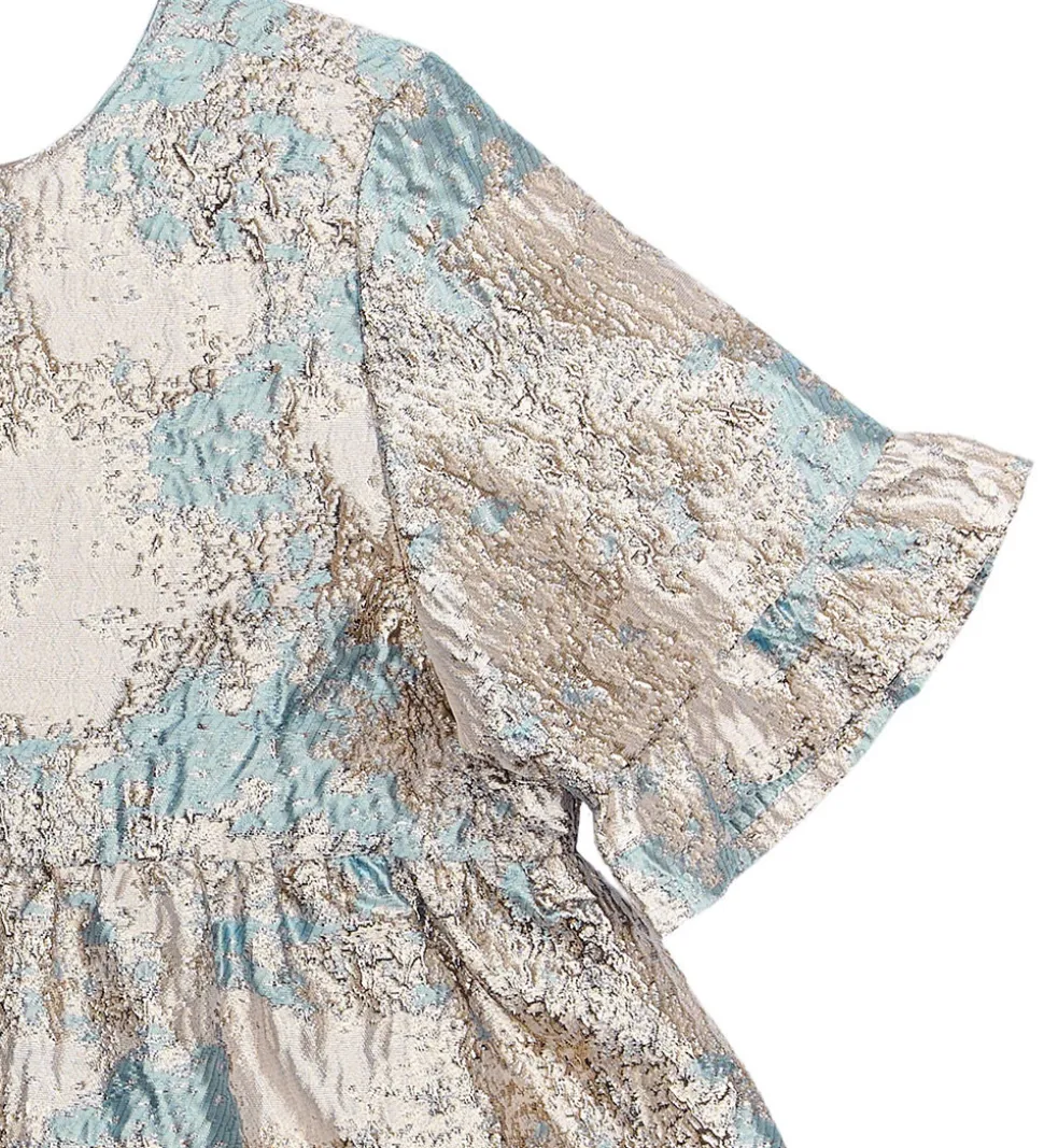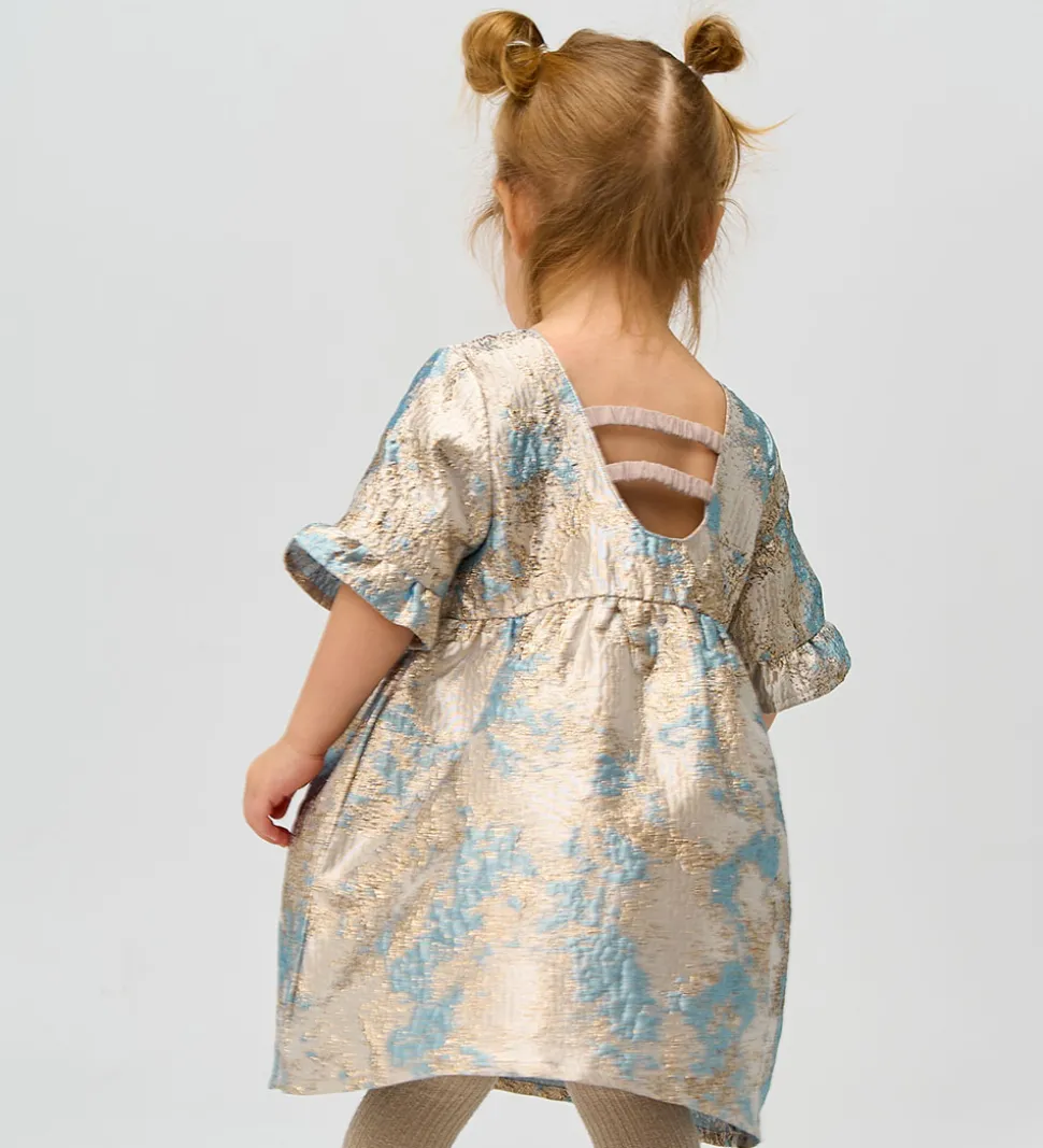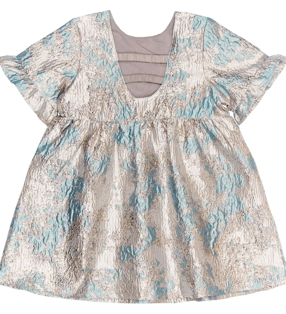 Elegant kjole fra The New Siblings i lyseblå og en skinnende, metallisk nuance. The New Siblings kjolen har korte ærmer med delikate flæser, samt en nedringet ryg.