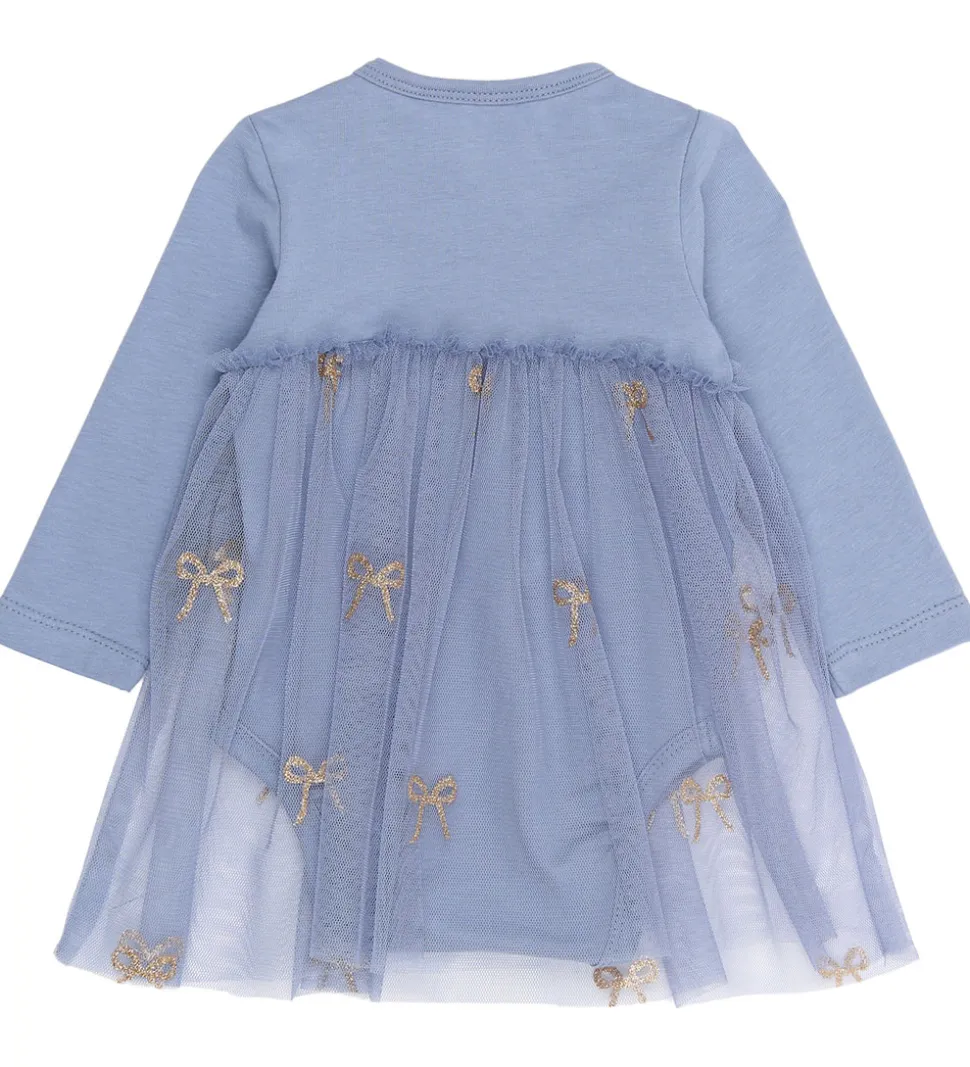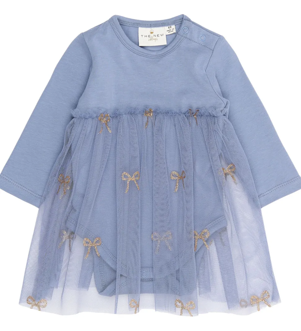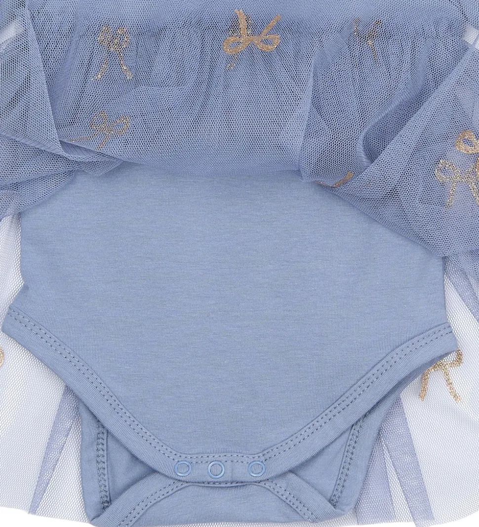 Kjolebodyen har et fint tylskørt med gyldne sløjfe-detaljer, der giver et unikt udtryk. The New Siblings kjolebodyen har praktiske trykknapper på skulderen og i bunden for nem påklædning.