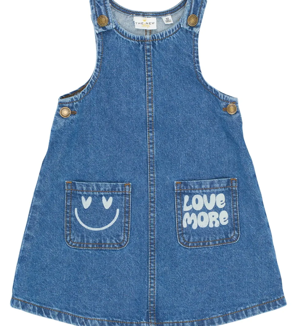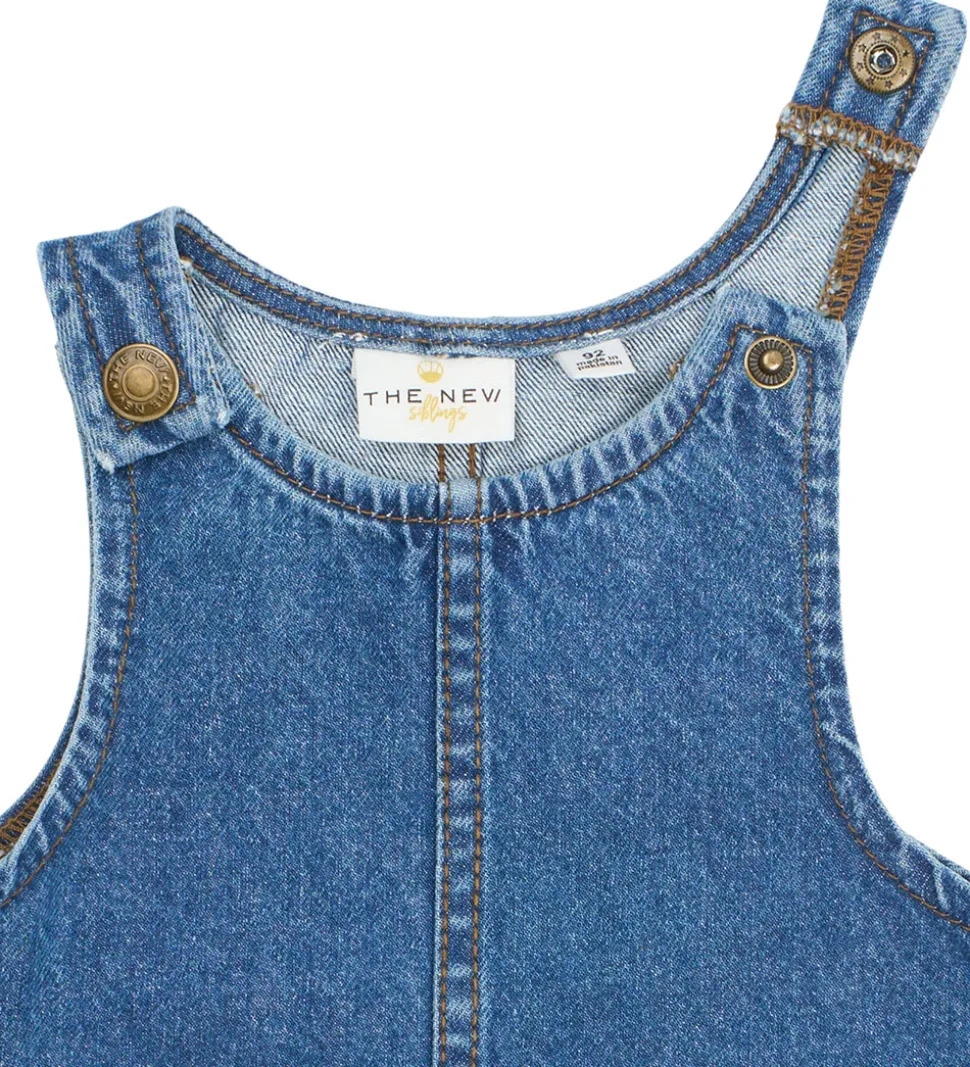 Sød spencer fra The New Siblings i blå denim og med fine motiver fortil på de to åbne lommer i en lysere blå nuance. The New Siblings spenceren har brede skulderstropper, der lukkes med en trykknap fortil ligeom der er en trykknap i hver side, så den er nem at få af og på.