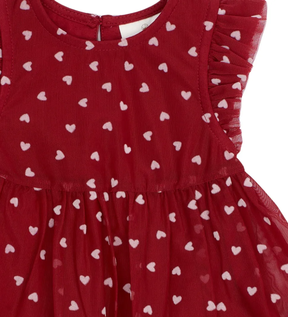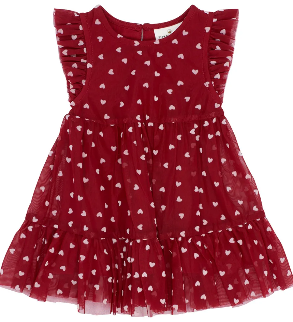 Elegant The New Siblings tylkjole i dyb, rød farve med rosafarvede hjerter.