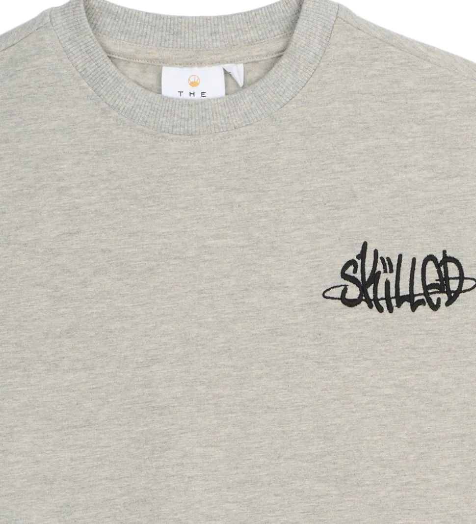 Stilfuld The New sweatshirt i en meleret, lysegrå nuance og med et unikt, sort print på brystet, samt med et stort terninge-print på ryggen.