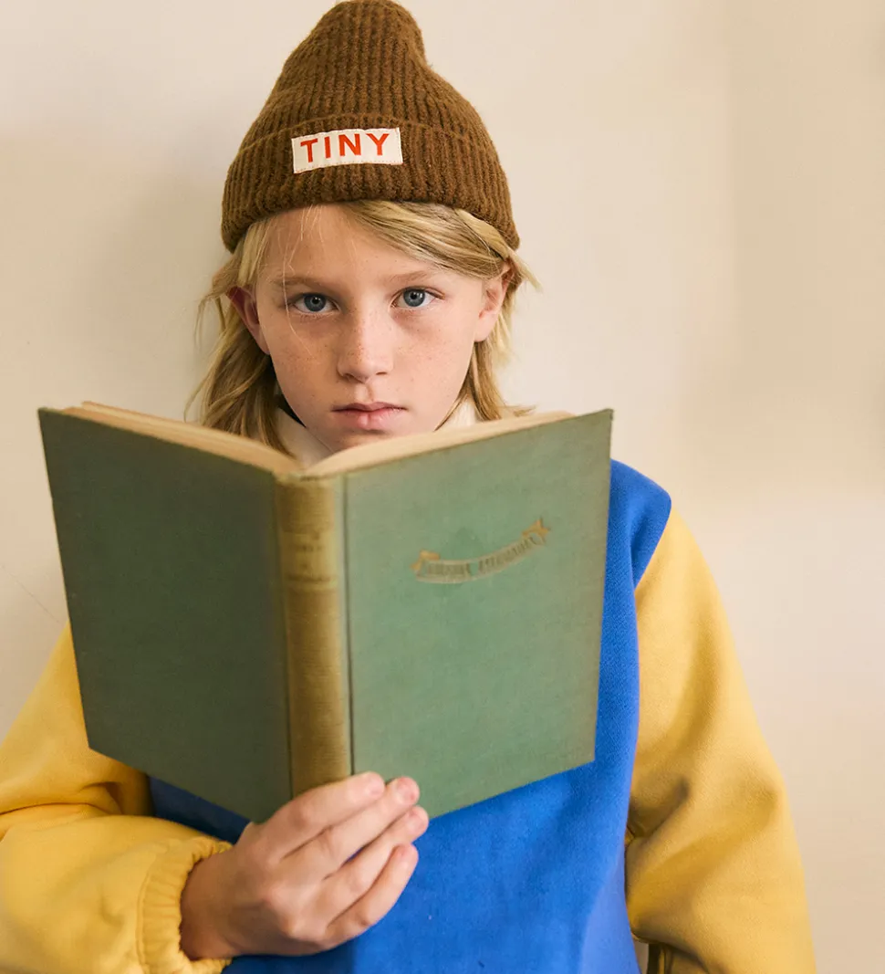 Behagelig hue fra Tiny Cottons i en varm brun nuance i en strikket kvalitet med en flot ribstruktur. Foran prydes huen af et tydeligt mærkelogo i rød kontrast på en hvid baggrund, hvilket giver et genkendeligt udtryk. Huen fra Tiny Cottons kombinerer enkelhed og funktionalitet på en elegant måde.
