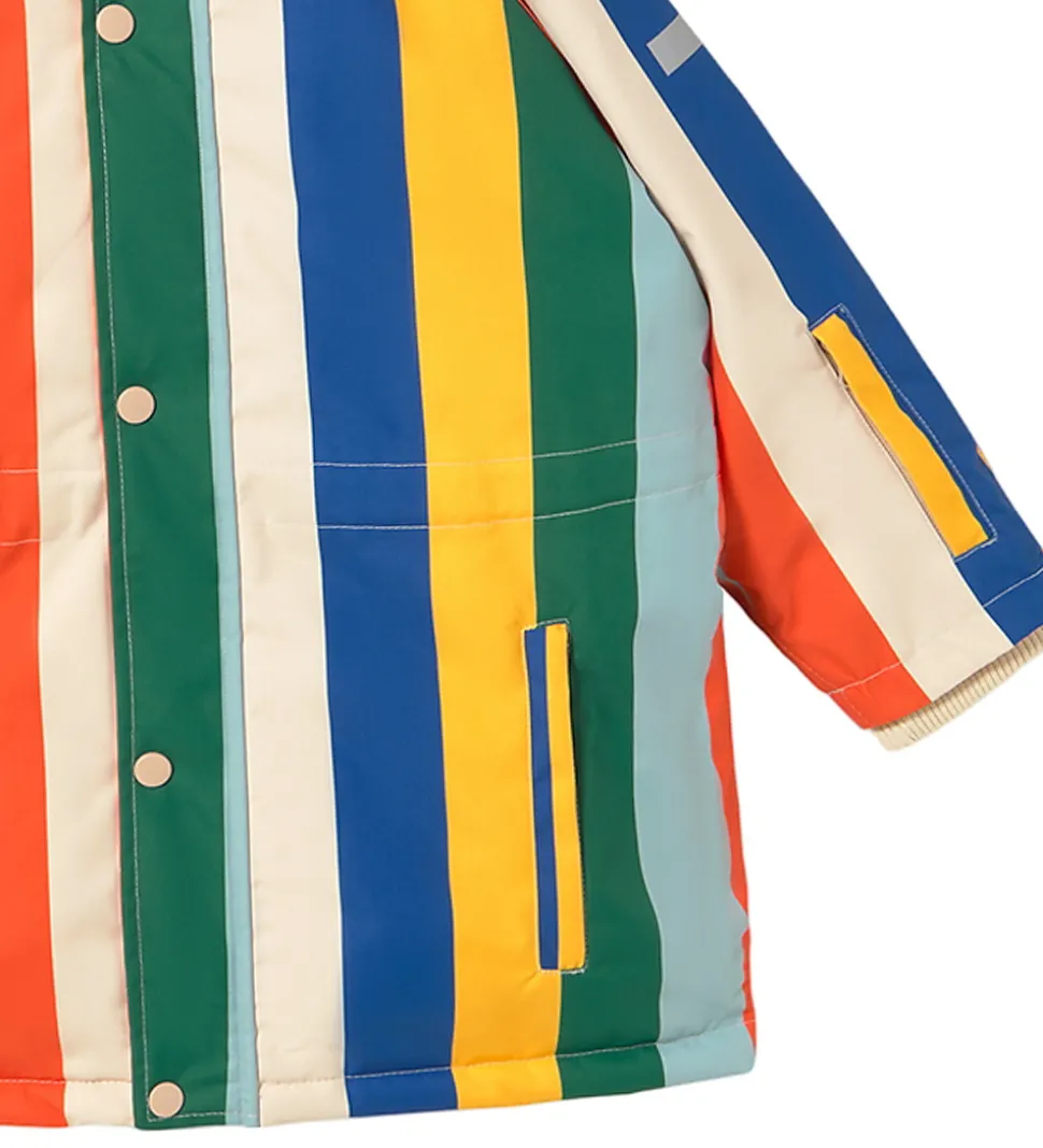 Farverig Tiny Cottons vinterjakke med brede lodrette striber i blå, orange, gul, rød og grøn.