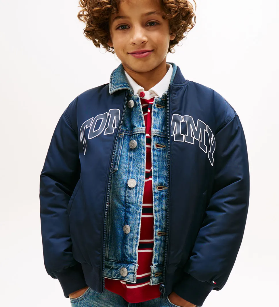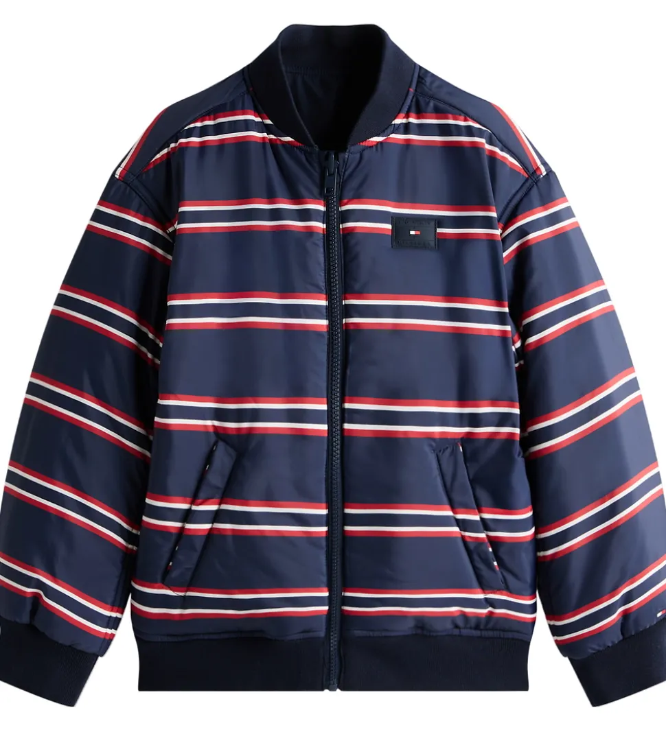 Lækker Tommy Hilfiger dynejakke i et vendbar design. Den ene side er navy med et logo-gummiprint midt på brystet, mens den anden side er navyblå med striber i brandets klassiske farver; rød, hvid og navy.