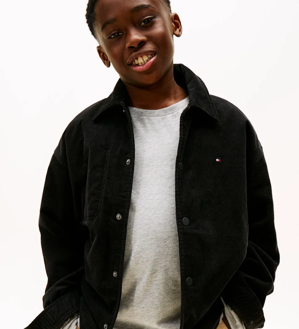 Stilfuld Tommy Hilfiger overgangsjakke i klassisk sort fløjl. Den er let foret med quilt og åbnes fortil med trykknapper. Overgangsjakken har lange ærmer og et diskret logo på brystet. I siderne findes åbne lommer og indeni er der en åben brystlomme. Et tidløst valg fra Tommy Hilfiger, der kombinerer kvalitet og enkelt design.