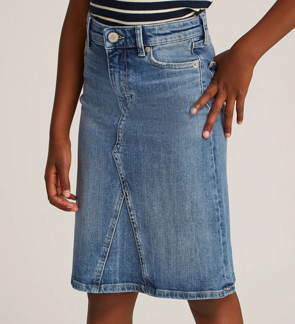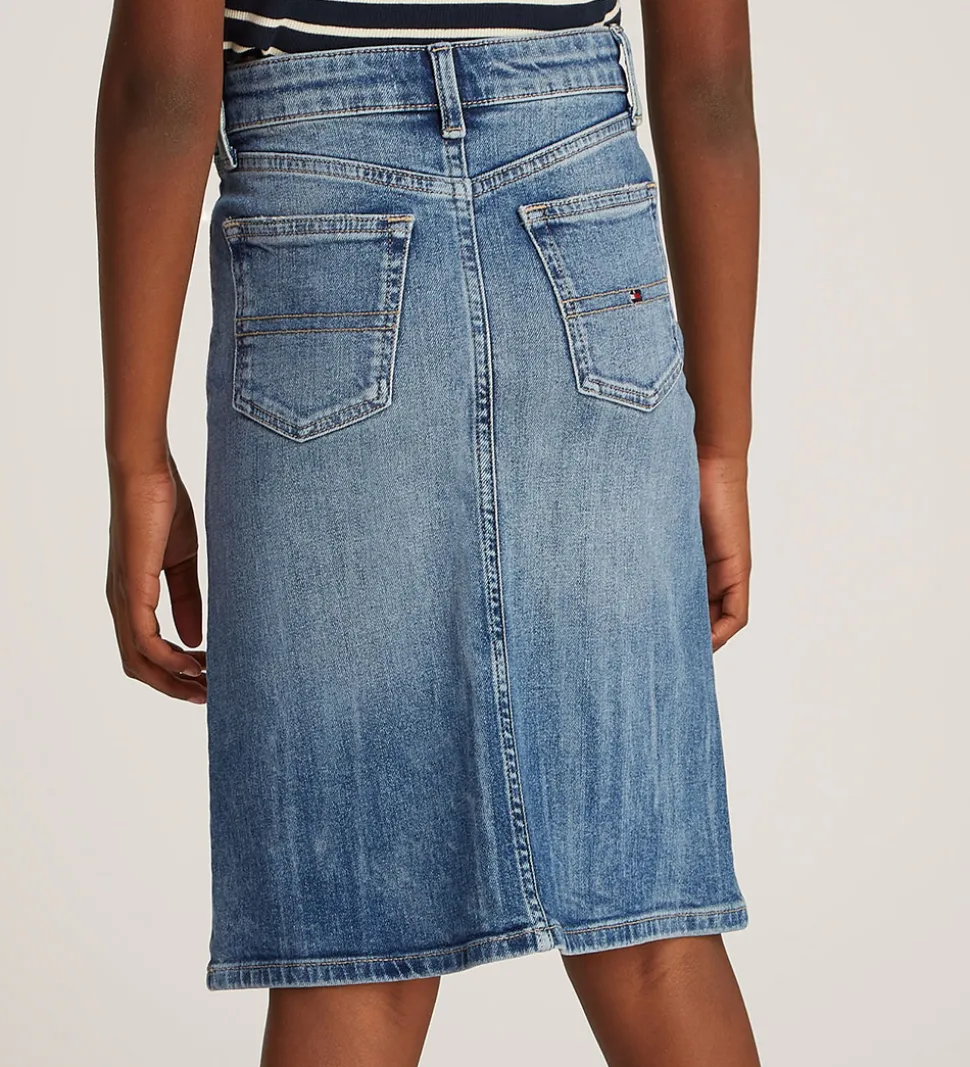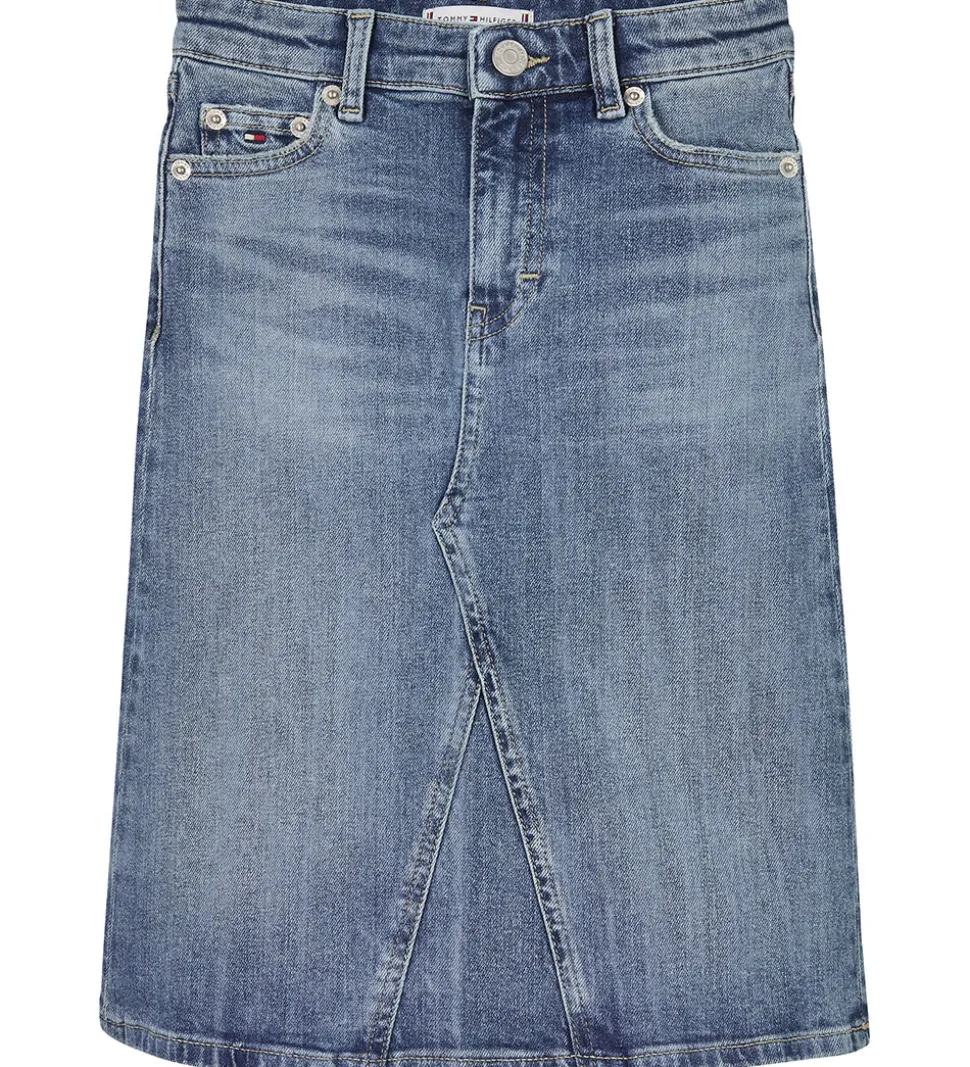 Lækker Tommy Hilfiger nederdel i en lys denimfarve med en praktisk skrålukning foran. Nederdelen har en klassisk pasform og kan nemt styles til forskellige looks.