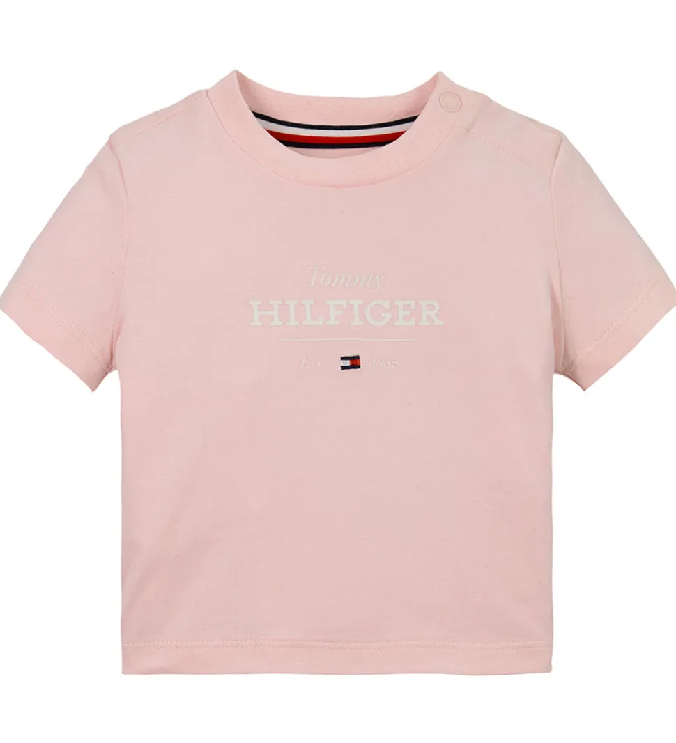 Charmerende Tommy Hilfiger shortssæt i rosa bestående af et t-shirt med hvidt logoprint på fronten og et par shorts. T-shirten har en rund halsudskæring med en smal ribkant og praktiske trykknapper ved venstre skulder. Shortsene har en bred elastik i taljen, som kan justeres med snøre fortil. Øverst er der en lomme i hver side og bagtil er der en lomme i højre side.