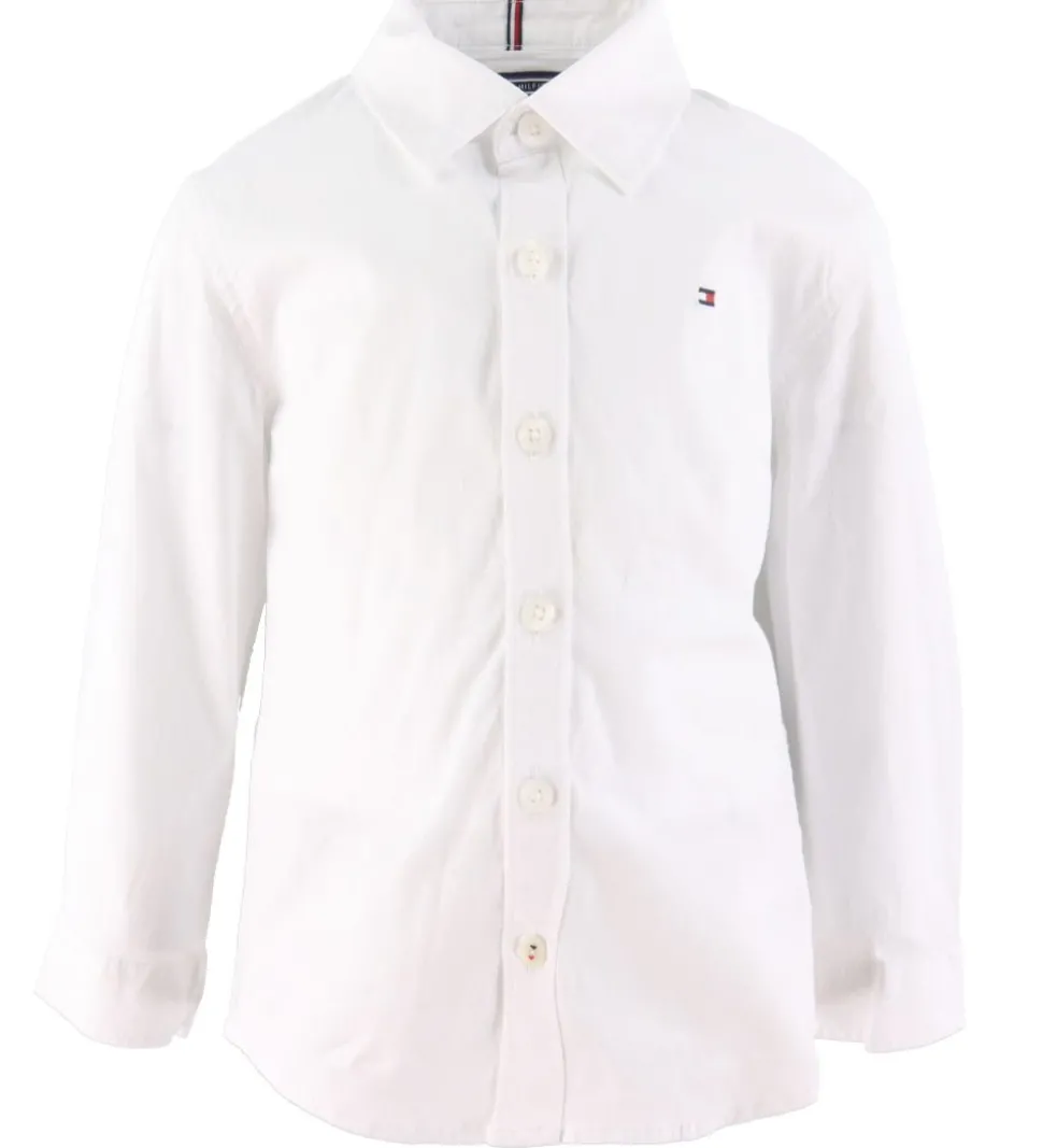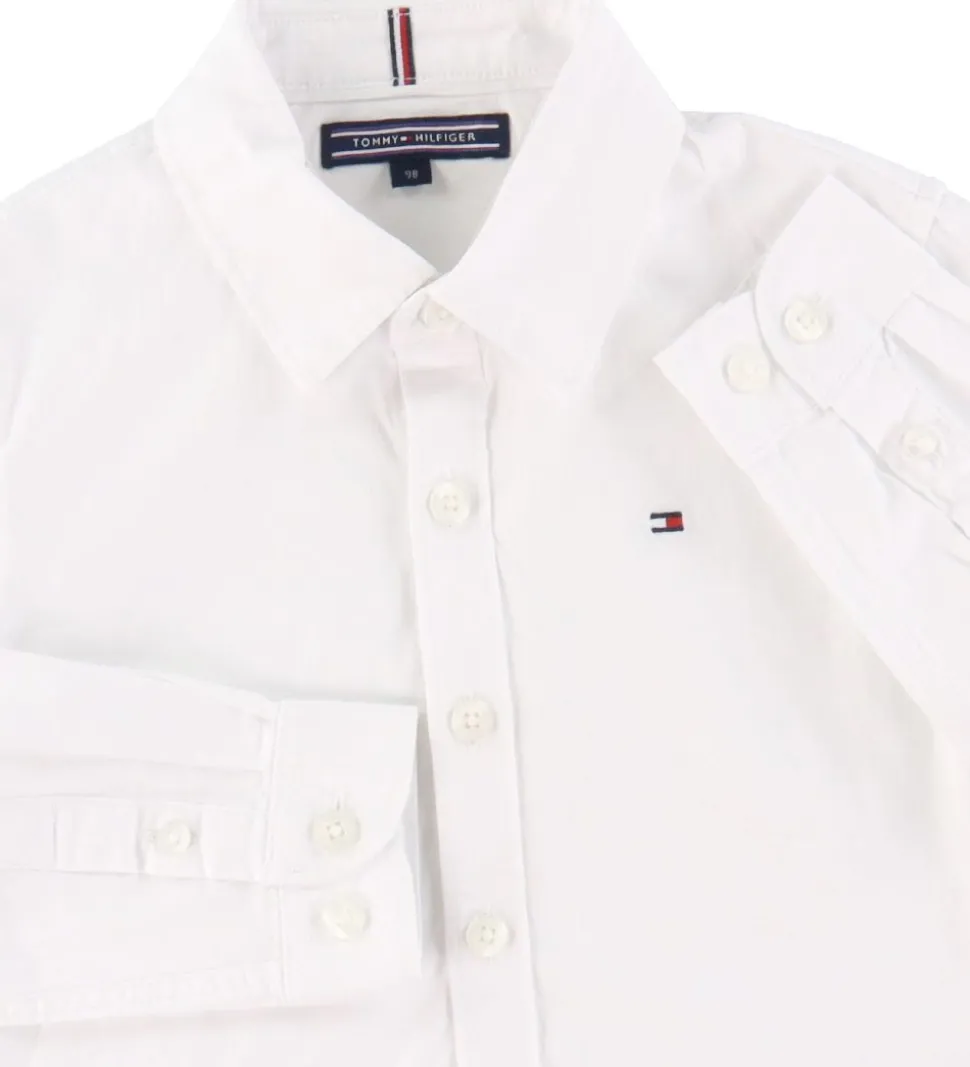 Fin Tommy Hilfiger skjorte i ensfarvet hvid med hvide knapper. Fortil er der broderet et lille logo, og som en smart detalje er den nederste knap fortil syet fast med en rød, en hvid og en navy tråd.