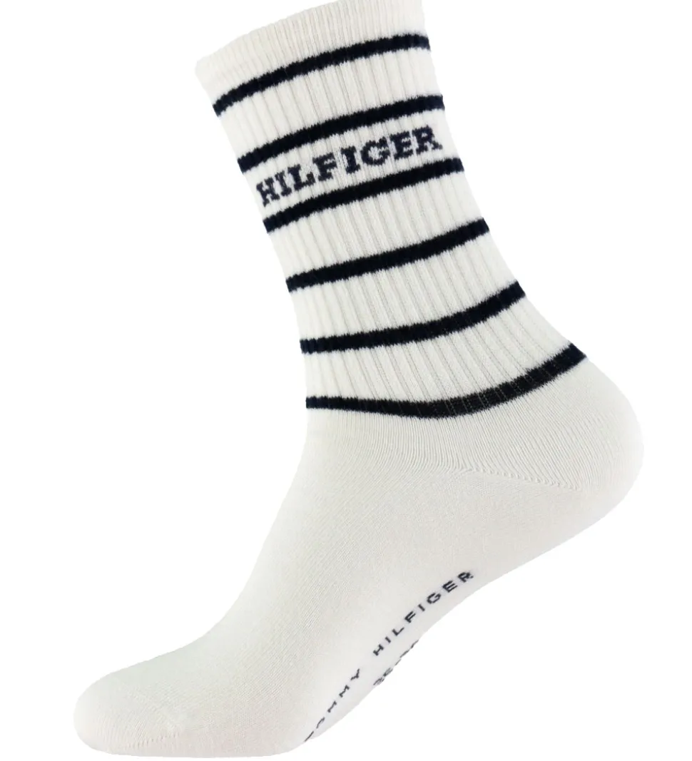 Klassiske Tommy Hilfiger strømper solgt i en 2-pak. Et par i grå med glimmer og med vandrette sorte striber og et i hvid med sorte striber. Begge har ribkant og Tommy Hilfiger-logoet tydeligt trykt på skaftet samt under foden. Strømperne har ribstruktur på skaftet.