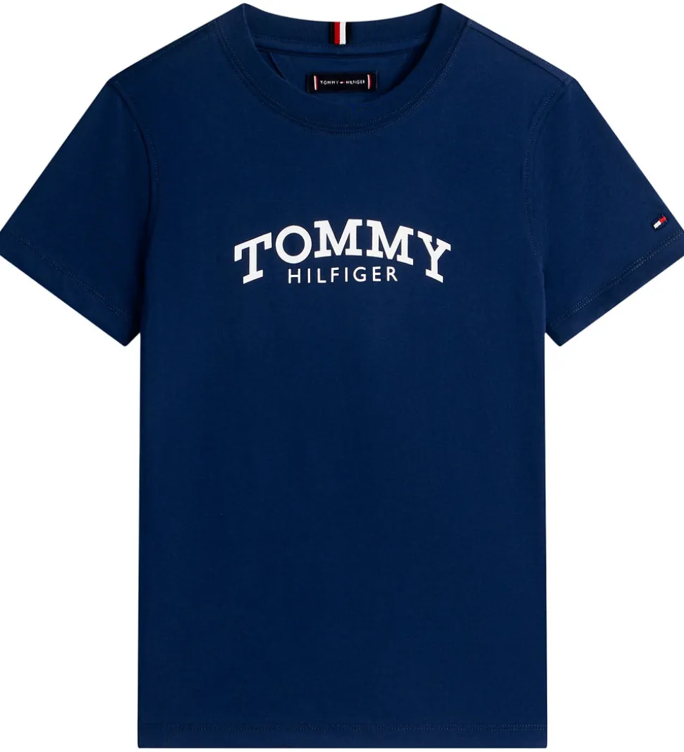 Skøn Tommy Hilfiger t-shirt i navyblå med et hvidt logoprint på fronten. T-shirten har en rund halsudskæring med en smal ribkant og korte ærmer.