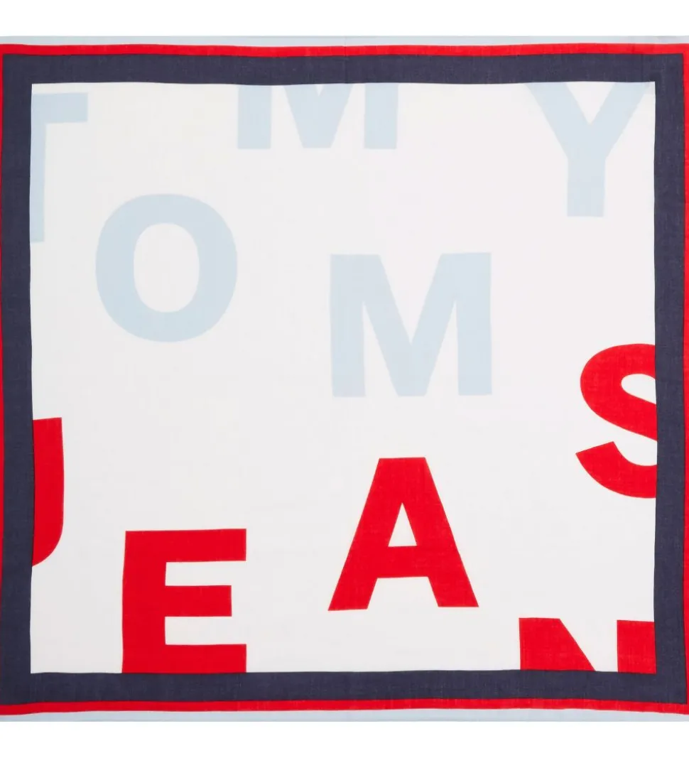 Flot Tommy Hilfiger tørklæde i hvid med en bred kant i navy, rød og lyseblå. Tørklædet har teksten “Tommy Jeans” stående i lyseblå og rød.