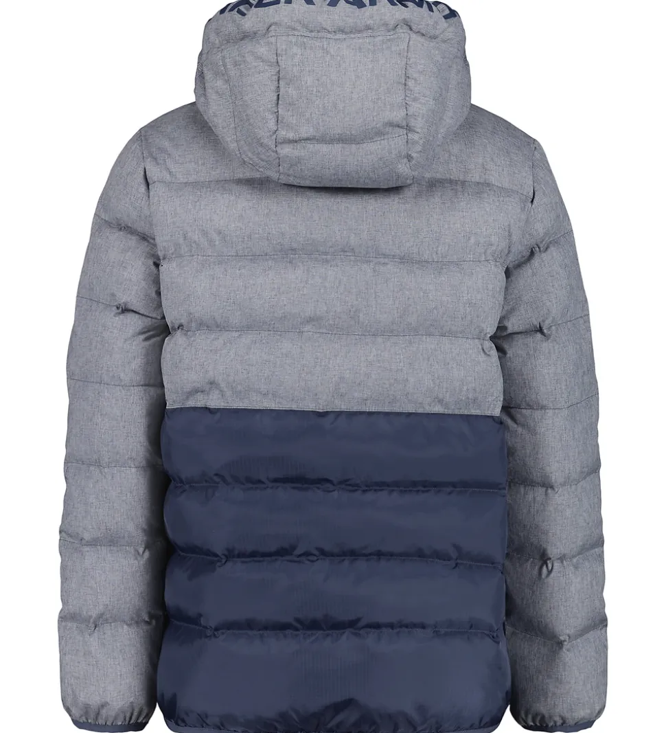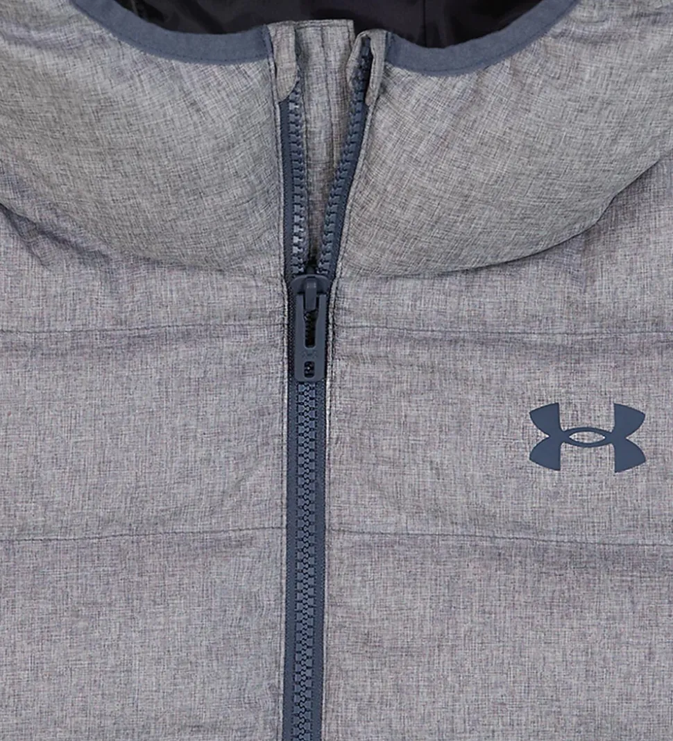 Flot Under Armour dynejakke i i gråmeleret og mørkeblå. Dynejakken har et logoprint på venstre bryst samt på hætten.