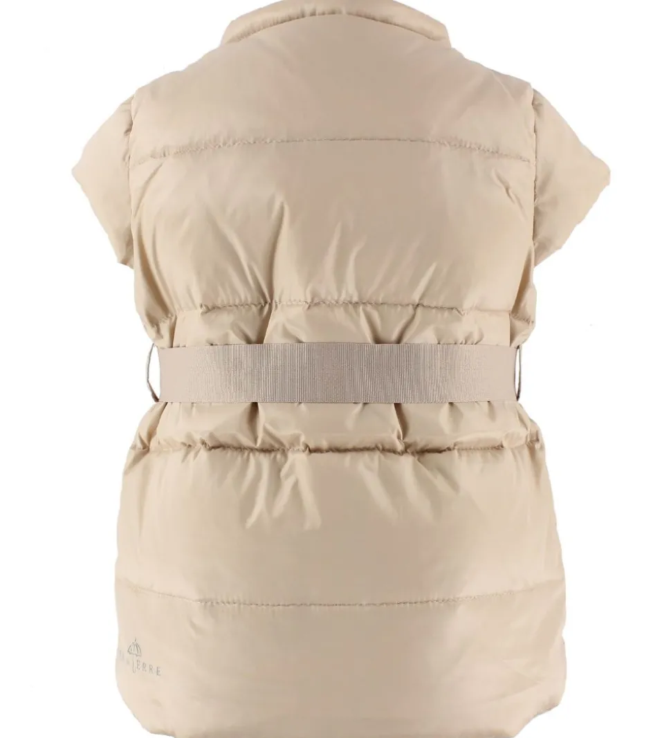 Ver de Terre dunvesten har helt korte ærmer, og den åbnes med mørke metalknapper. I livet er der et fint bælte i en fastvævet kvalitet. Fortil er der to praktiske lommer, som lukkes med en skjult lynlås. Dunvesten er perfekt som ekstra lag på de kølige dage.