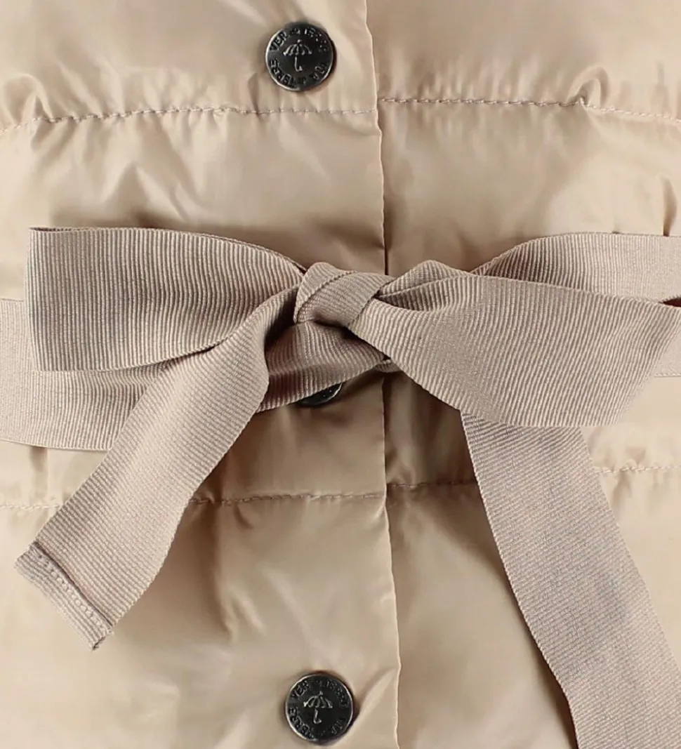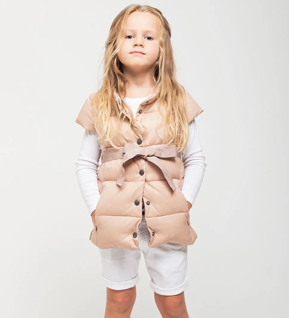 Sød Ver de Terre dunvest i lys rosa og med et rosa bælte i livet. Dunvesten er lavet i et glatvævet materiale med vandrette syninger, der giver et klassisk dunjakke look.