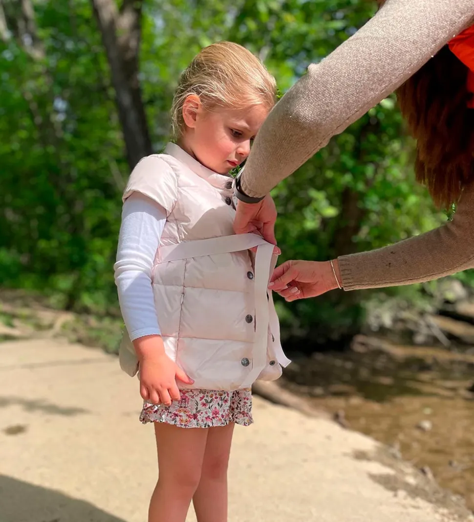 Sød Ver de Terre dunvest i pudderrosa og med et pudderrosa bælte i livet. Dunvesten er lavet i et glatvævet materiale med vandrette syninger, der giver et klassisk dunjakke look.