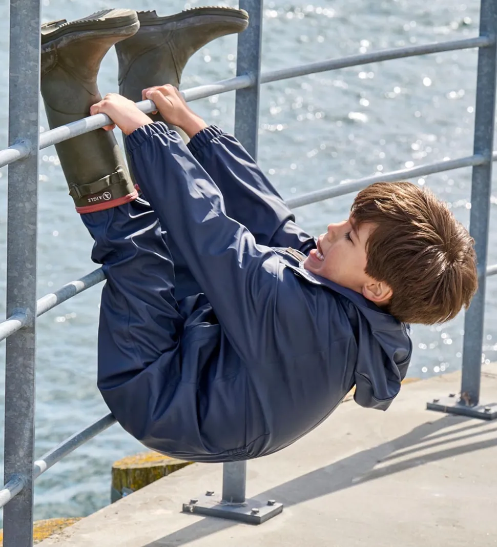 Ver de Terre regndragten har en aftagelig hætte, som sidder fast med sølvfarvede trykknapper, og den lukkes foran hagen med velcro. Ærmerne og buksebenene har brede elastikkanter, og buksebenene har praktiske elastikstropper til at sætte under gummistøvlerne.