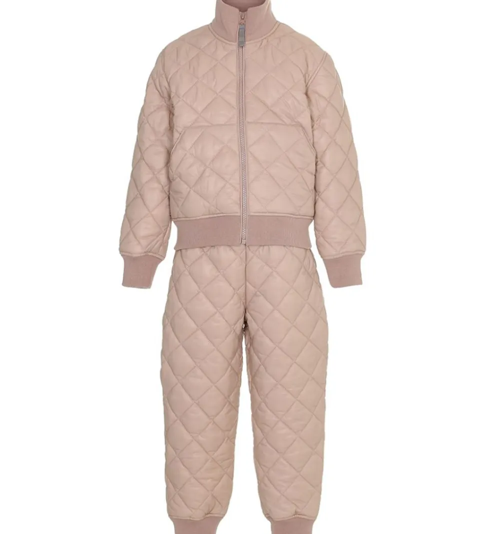 Fint Ver de Terre termotøj i pudderrosa og det består af en termojakke og et par termobukser.