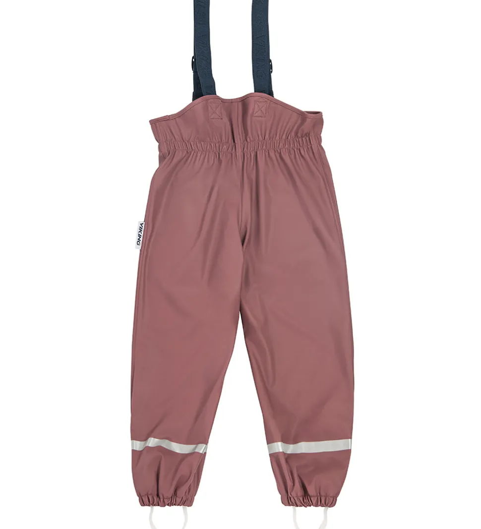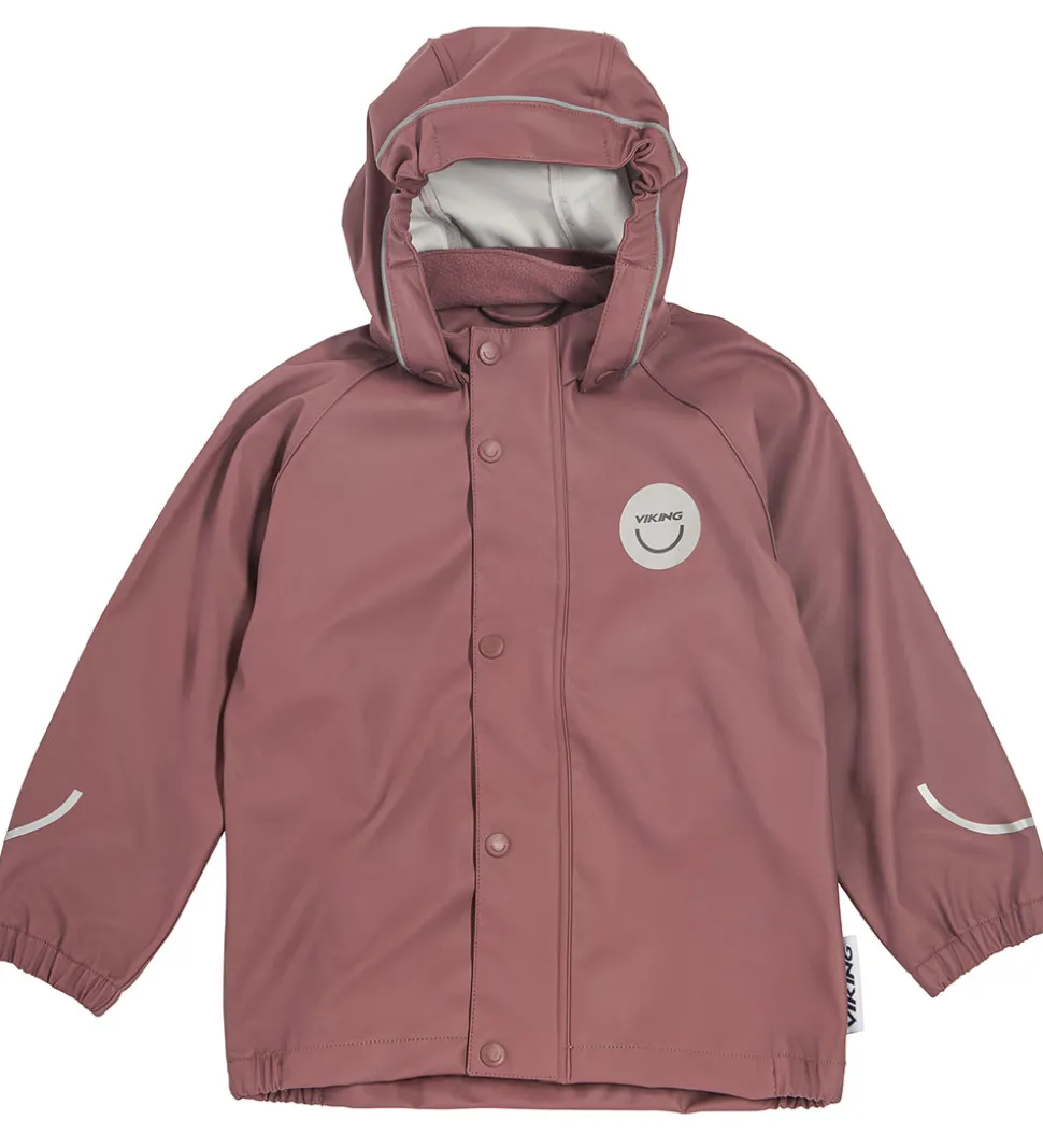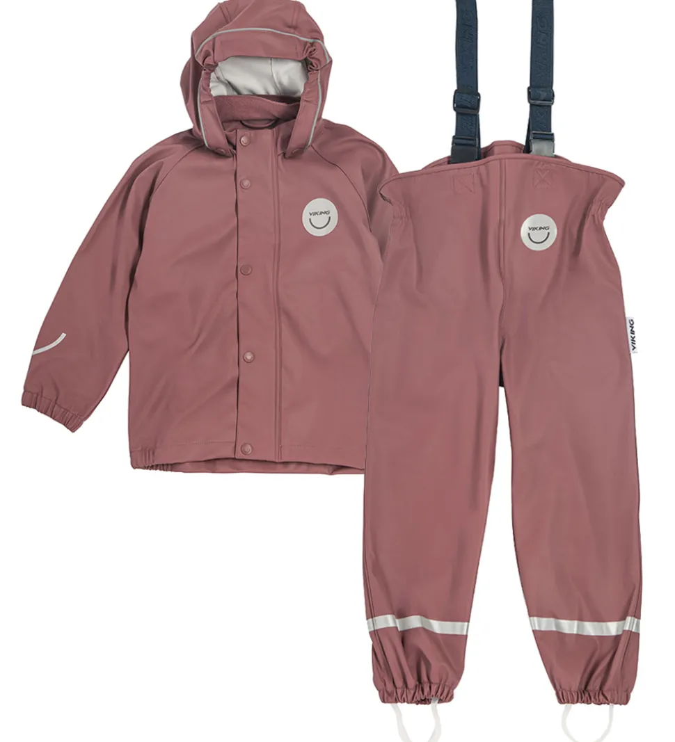 Fint Viking regntøj bestående af en regnjakke og et par regnbukser med seler i ensfarvet, mørk rosa PU med reflekslogo og mange refleksdetaljer.