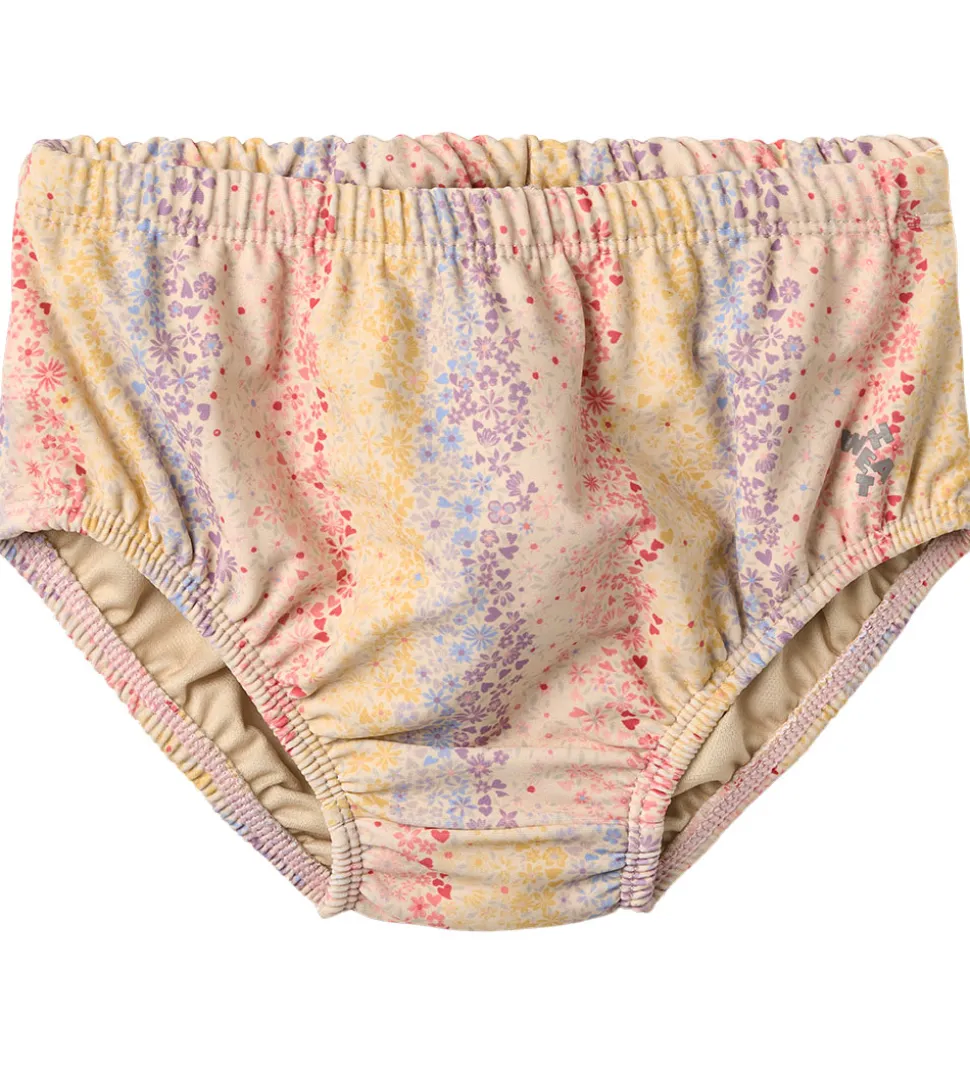 Smukke Wheat blebadebukser i en lys, beige nuance dekoreret med et fint blomstermønster i pastelfarver som lilla, rosa og gul. Designet udstråler en naturlig elegance med sit harmoniske brug af farver og mønstre.
