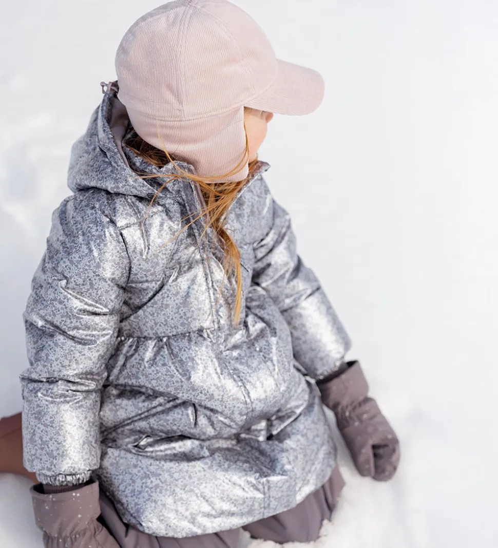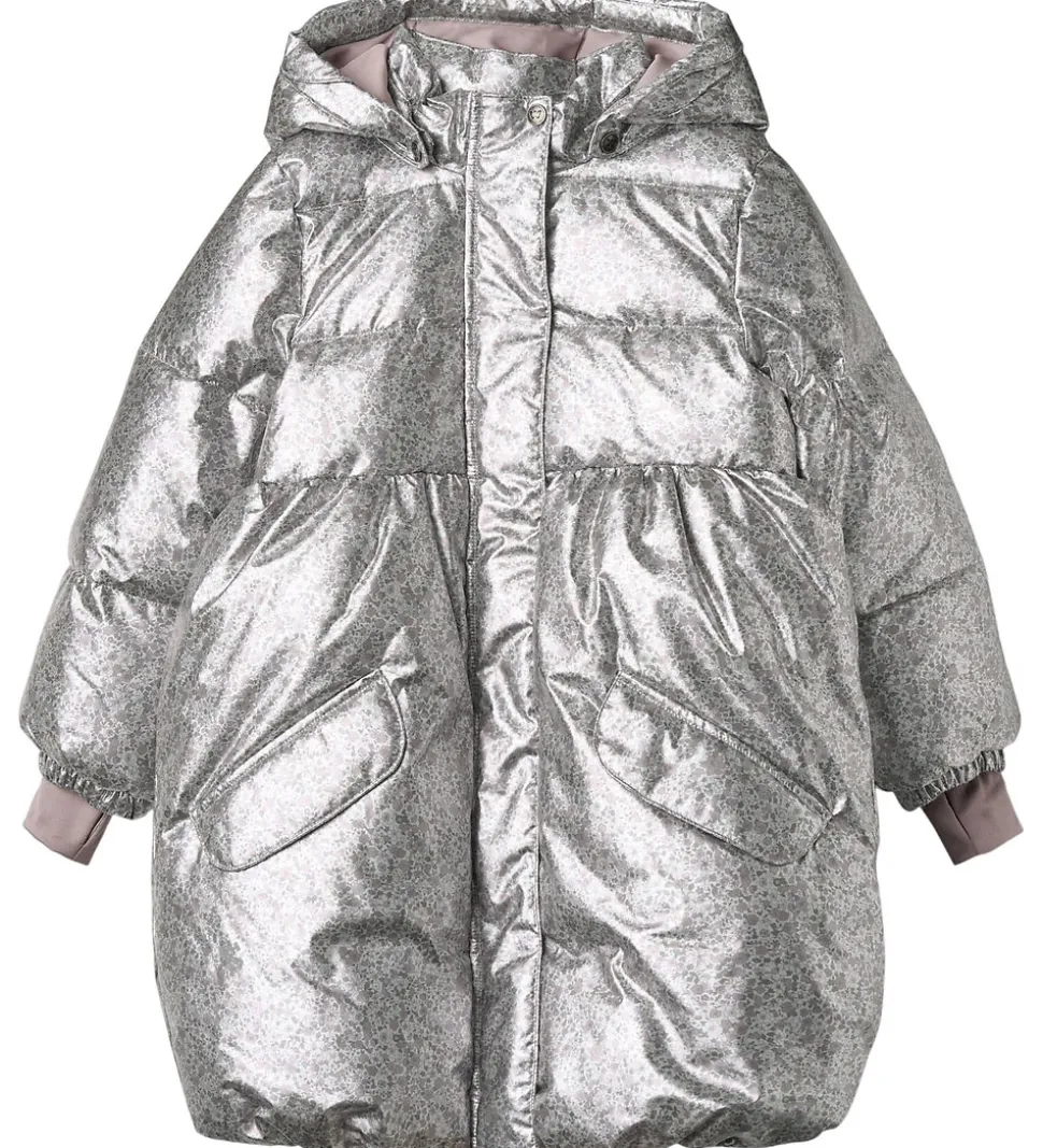 Lækker Wheat dynejakke i en skinnende sølvfarve med et alloverblomsterprint i støvet lilla, rosa og grønne farver. Dynejakken har vandrette syninger.