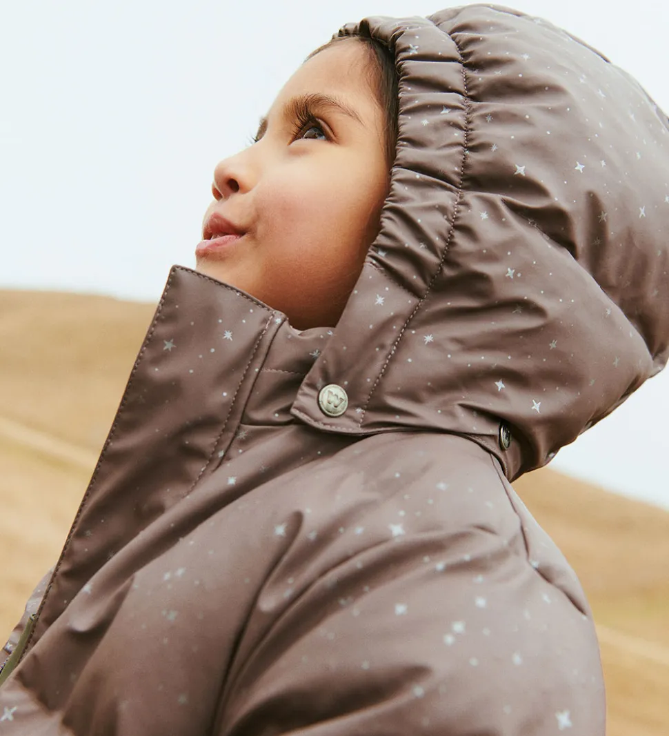 Skøn Wheat dynejakke af PU i lilla med print af små stjerner og med en struktur af indprægede, vandrette linjer. Dynejakken har velplacerede refleks-logoer.