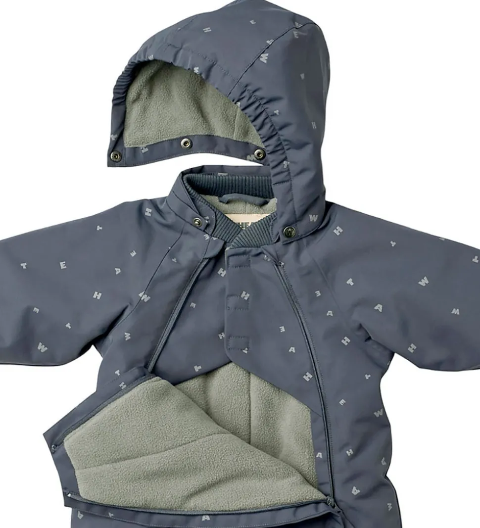 Sød Wheat flyverdragt i gråblå med alloverprint af bogstaver fra brandets navn. Flyverdragten rummer også både reflekspipings og -print.
