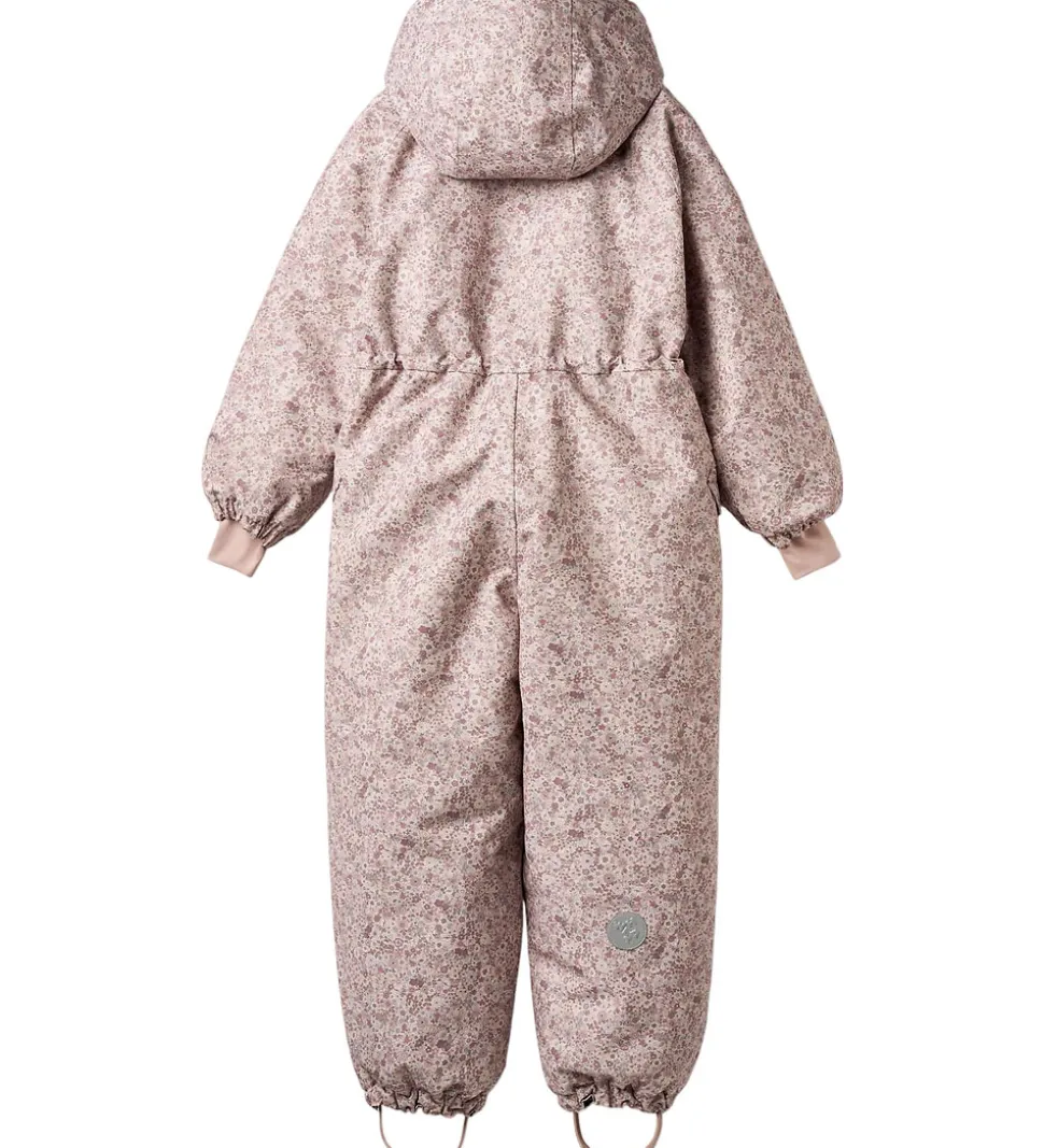 Skøn Wheat flyverdragt i rosa med et alloverblomsterprint i lilla, rosa og grønne farver. Flyverdragten rummer også både reflekspipings og -print.