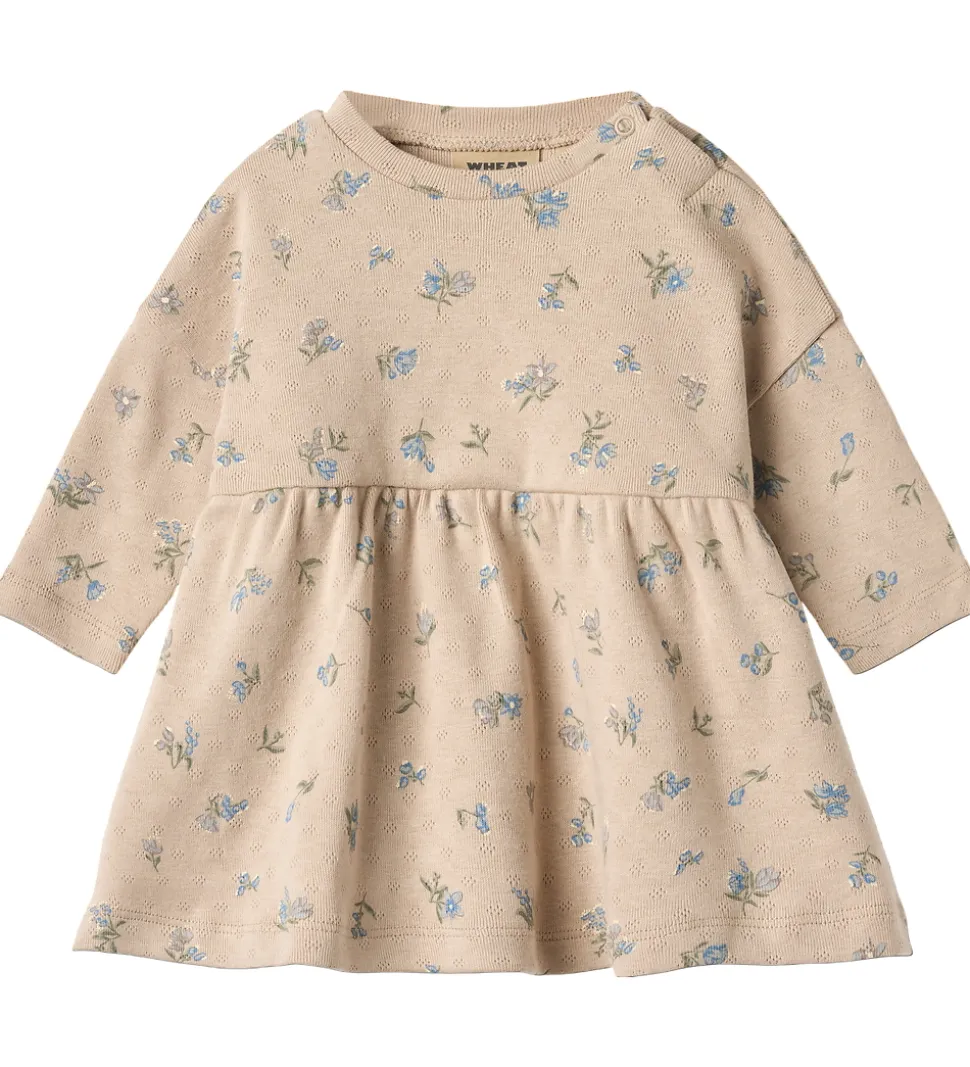 Yndig Wheat kjole i en lys beige nuance og med et delikat allover blomstermønster i blå og grønne toner. Wheat kjolen har en praktisk åbning med trykknapper over venstre skulder samt en elastisk syning i taljen, for en god og behagelig pasform.