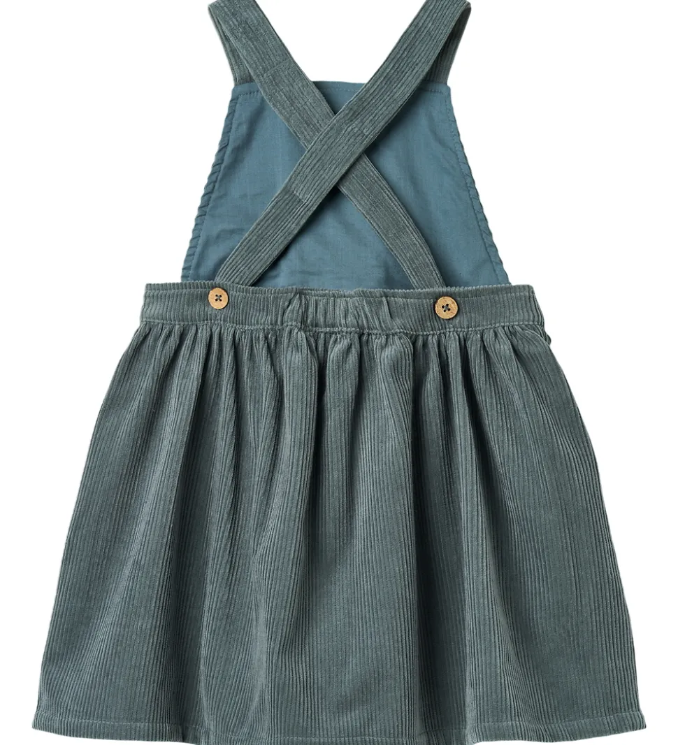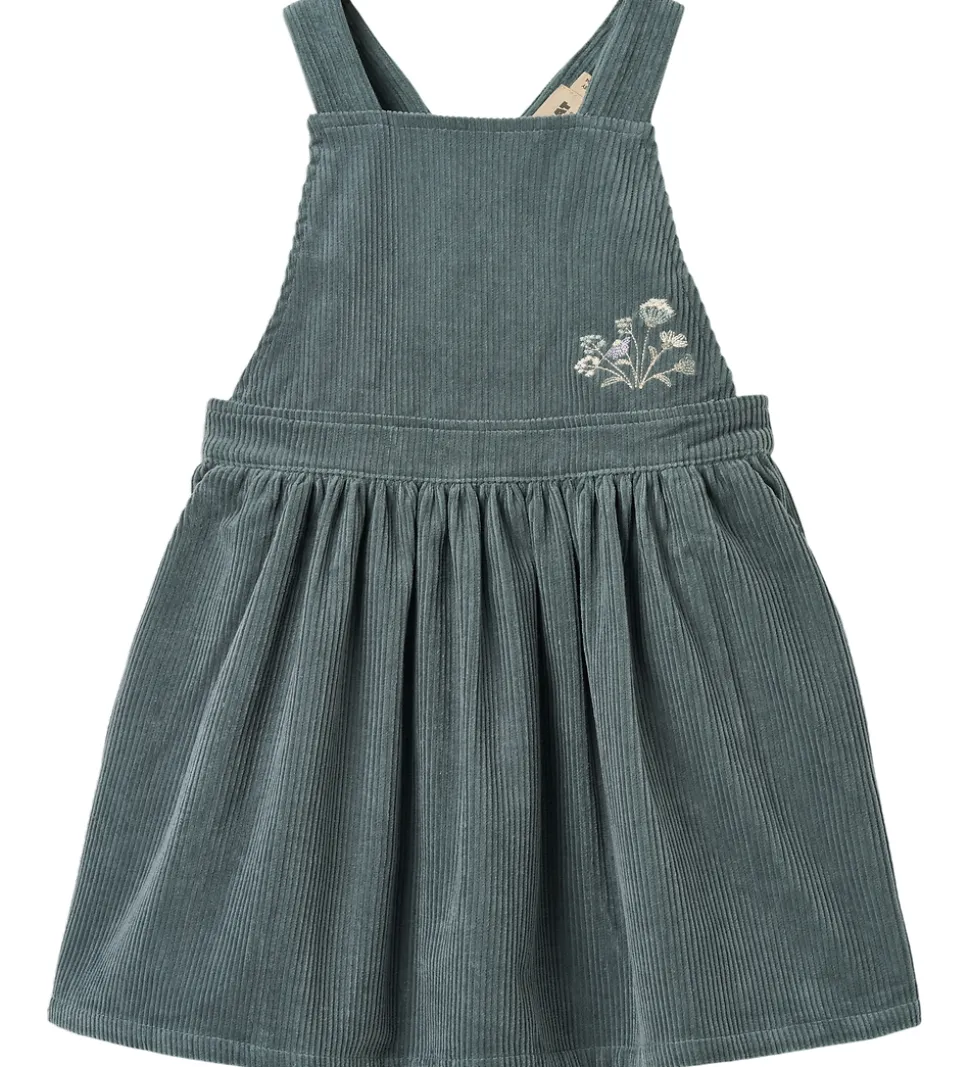 Elegant Wheat spencer i støvet blåt fløjl, og på brystet er der et fint blomsterbroderi. Kjolen har brede skulderstropper, som krydser opå rygge, og de kan justeres i to længder med en knap på ryggen. I lænden er der en bred elasttikkant, og skørtet har masser af vidde. I siderne er der praktiske lommer.