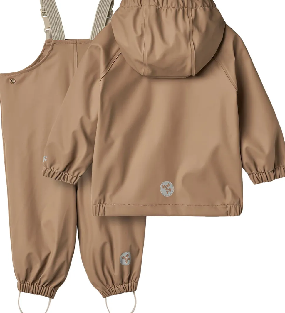 Lækkert Wheat regntøj af PU i nøddebrun og med refleksprint. Regntøjet består af en regnjakke og et par regnbukser med seler.