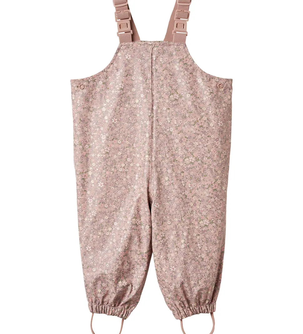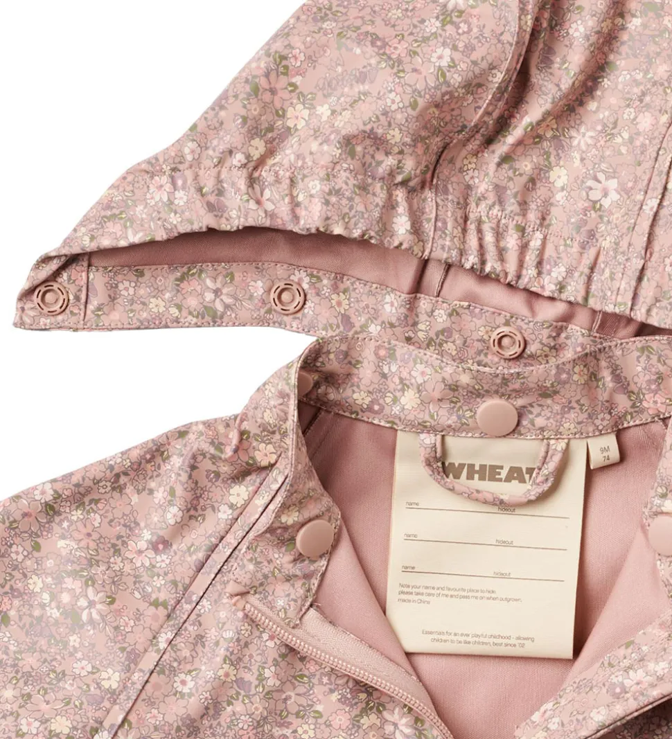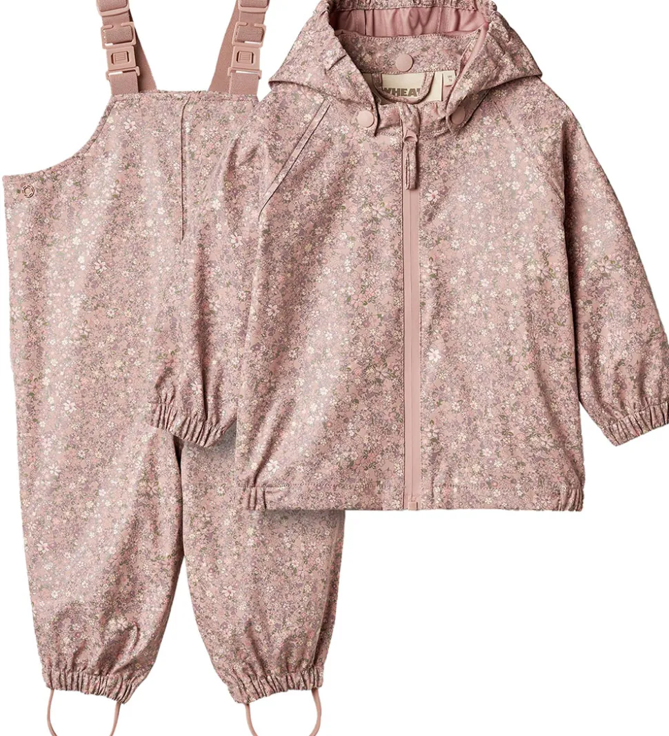 Lækkert Wheat regntøj af PU i rosa med et alloverblomsterprint samt med refleksprint. Regntøjet består af en regnjakke og et par regnbukser med seler.