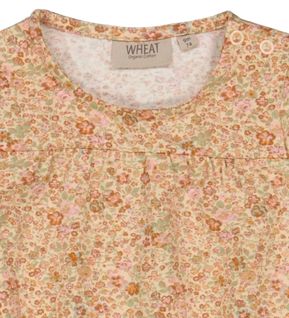Wheat sommerdragten har korte ærmer med let puf og en rund halsåbning med en smal ribkant. Dragten åbnes med praktiske trykknapper på venstre skulder samt mellem benene, og i arm- og benåbningerne er der smalle ribkanter. Sommerdragten er i en blød og strækbar bomuldskvalitet.