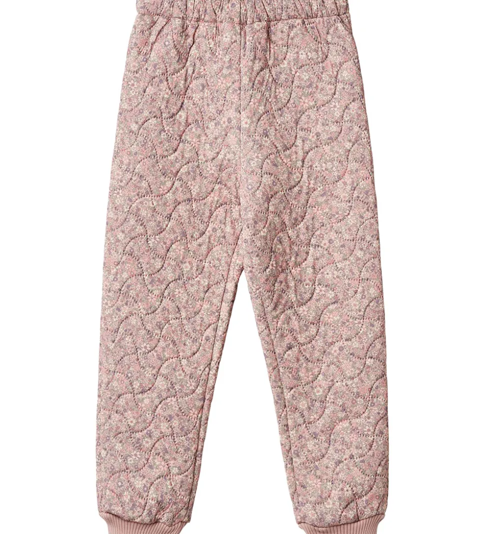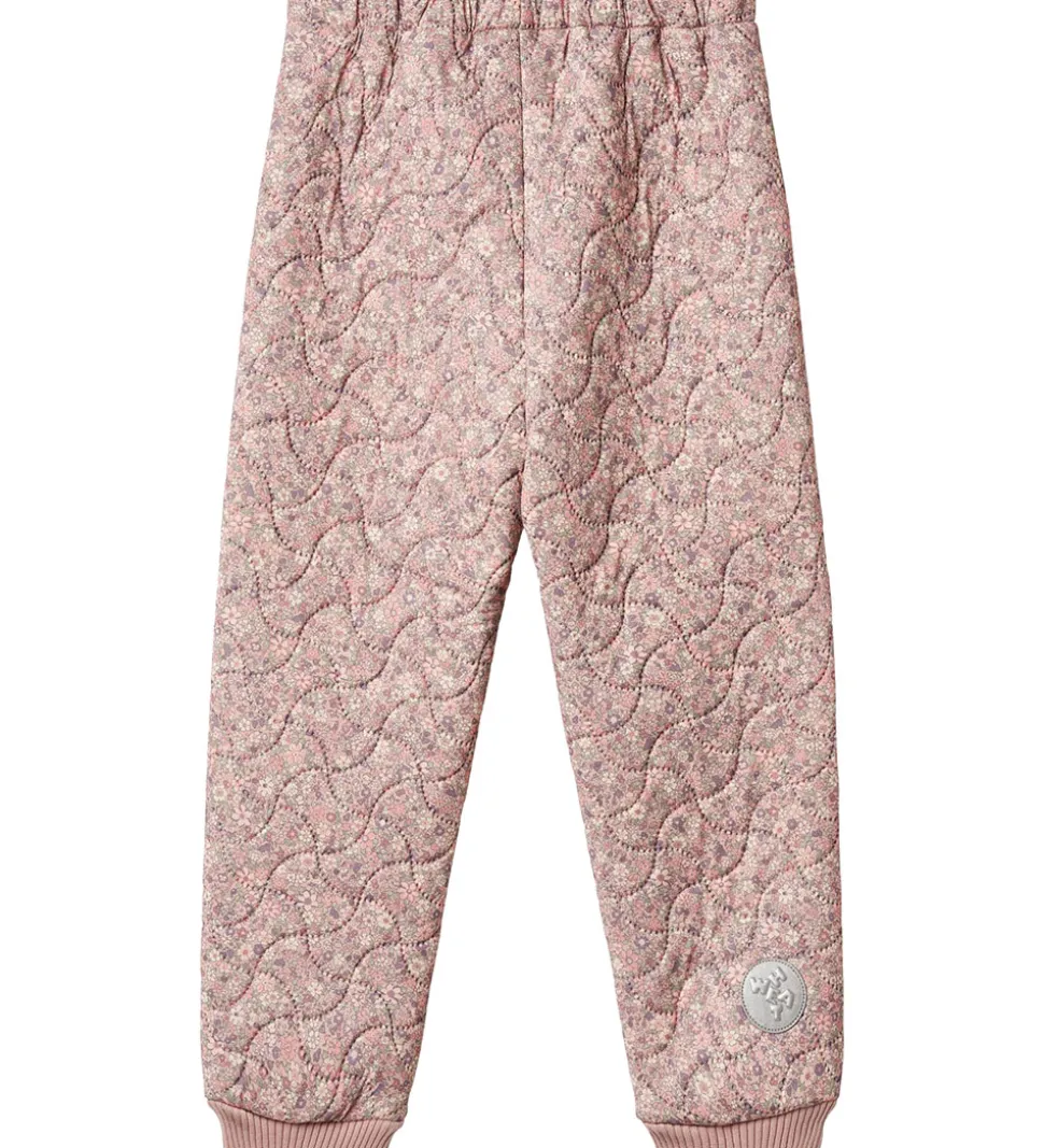 Pæne Wheat termobukser i rosa med et alloverblomsterprint. Termobukserne har en bølgende, quiltet struktur.