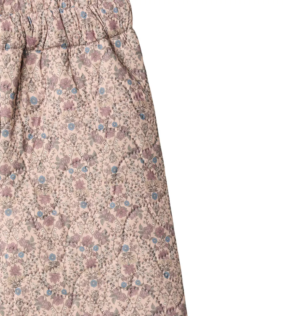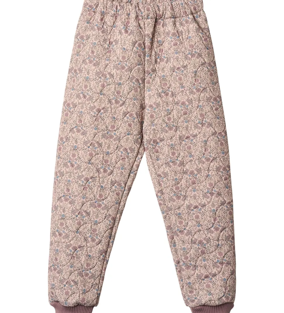 Flotte Wheat termobukser i lys rosa med et alloverblomsterprint i støvede lilla, blå og grønne nuancer og med ribkanter i støvet lilla. Termobukserne har en bølgende, quiltet struktur.