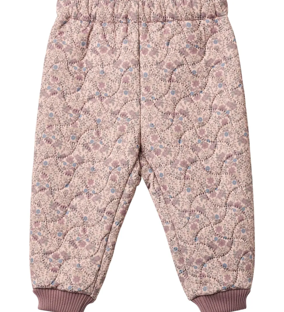 Fine Wheat termobukser i lys rosa med et alloverblomsterprint i støvede lilla, blå og grønne nuancer og med ribkanter i støvet lilla. Termobukserne har en bølgende, quiltet struktur.