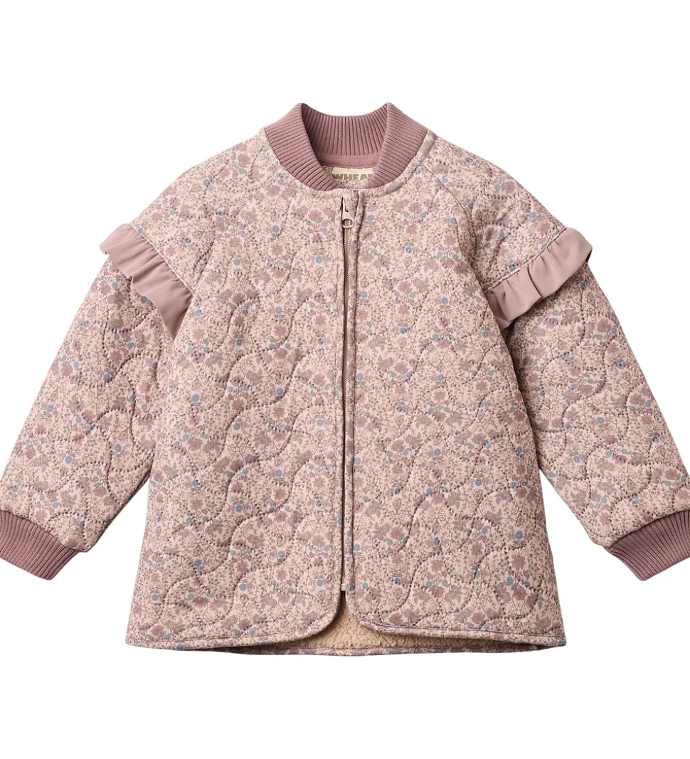 Rar Wheat termojakke i lys rosa med et alloverblomsterprint i støvede lilla, blå og grønne nuancer samt ribkanter og flæseskuldre i støvet lilla. Termojakken har en bølgende, quiltet struktur.
